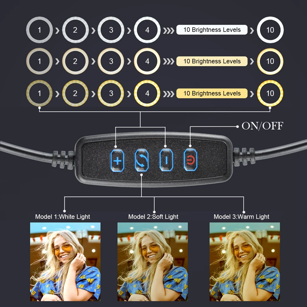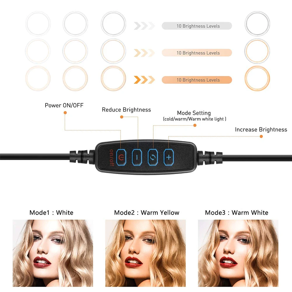 3 цвета (белый светильник, мягкий светильник и теплый светильник), каждый из которых имеет 10 уровней яркости. Идеальный дополнительный свет для макияжа, фотографирования, создания видео, чтения книг и потокового воспроизведения