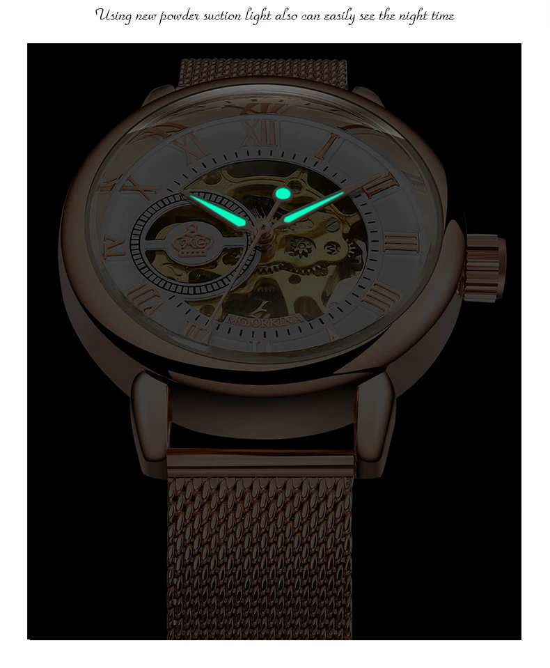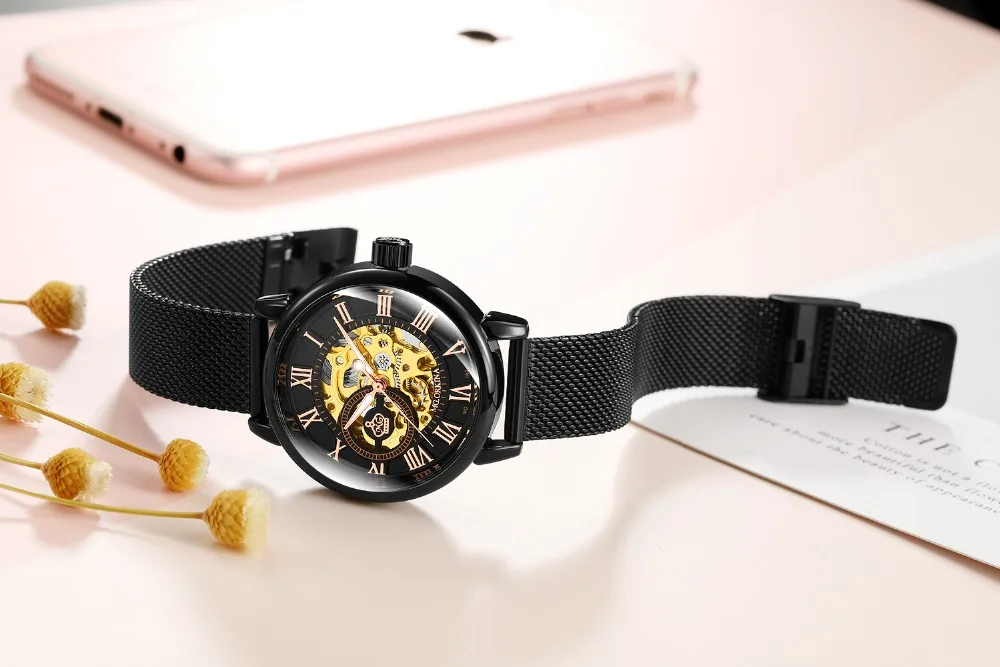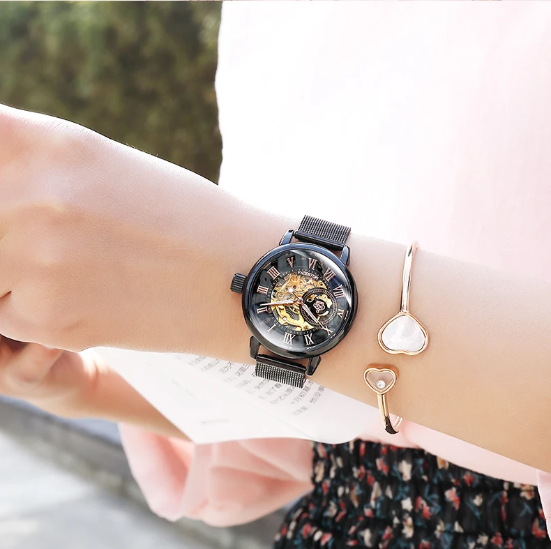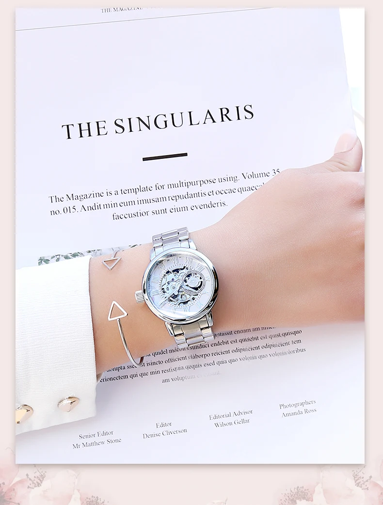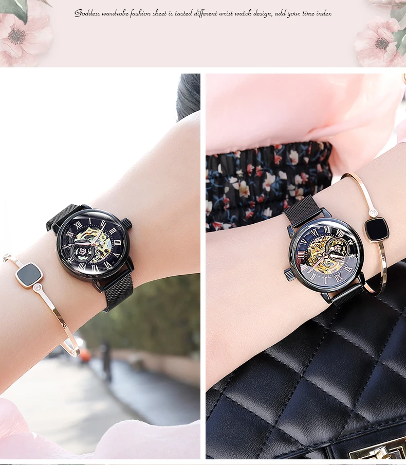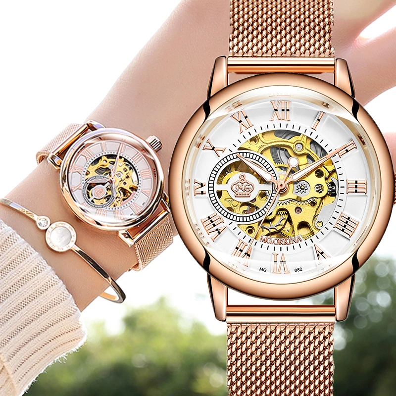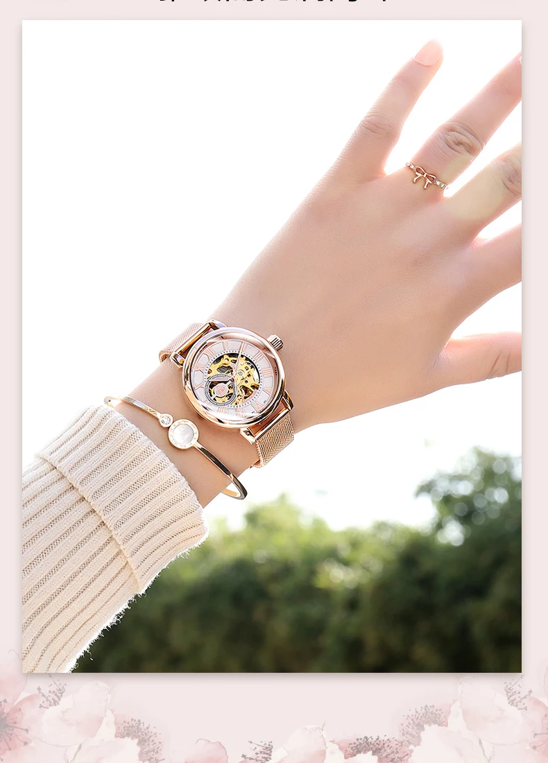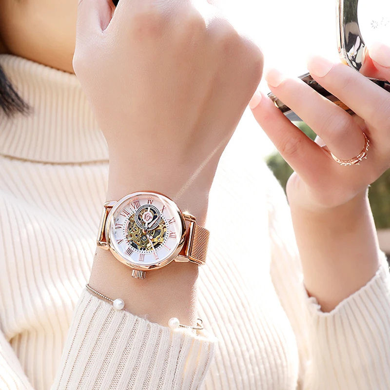 Часы наручные женские Автоматические механические, роскошные Брендовые Часы-скелетоны из нержавеющей стали, сетчатый ремешок, розовое золото, 2020