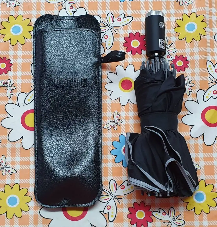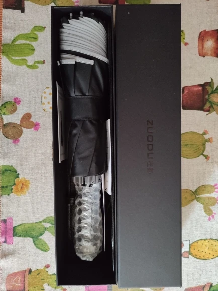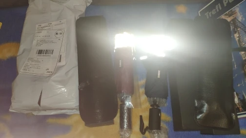 Почти мгновенная доставка в мск, в коробке был чехол кожаный, не знаю комплект или подарок. Ручка зонта довольно маленькая для мужской руки, не знаю насколько удобно будет нести такой зонт. фонарь работает, (нужно снять заглушку с батарейки), светит не ярко, но посмотрим как оно будет на ночной дождливой улице.