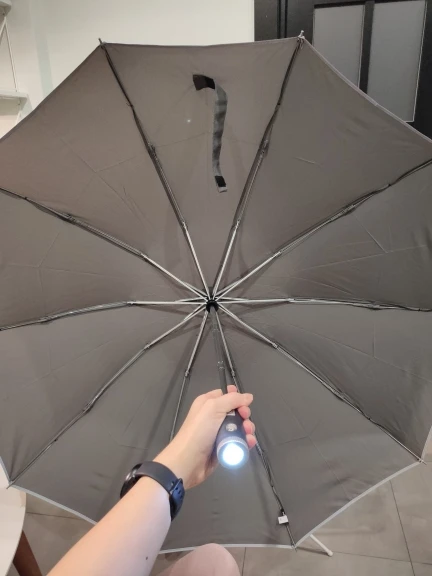 Отличный зонт, хорошее качество. Открывается и закрывается молниеносно, светоотражающая лента светится в темноте, фонарик достаточно яркий (батарейка была в комплекте). Пришло всё в солидной коробке, подарить не стыдно.