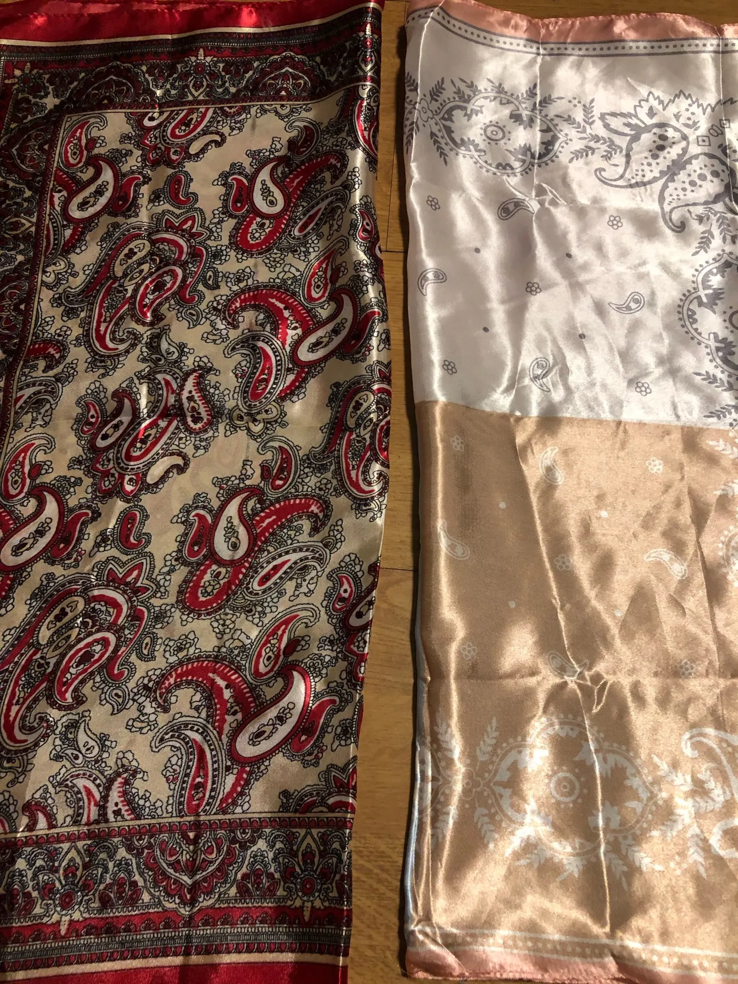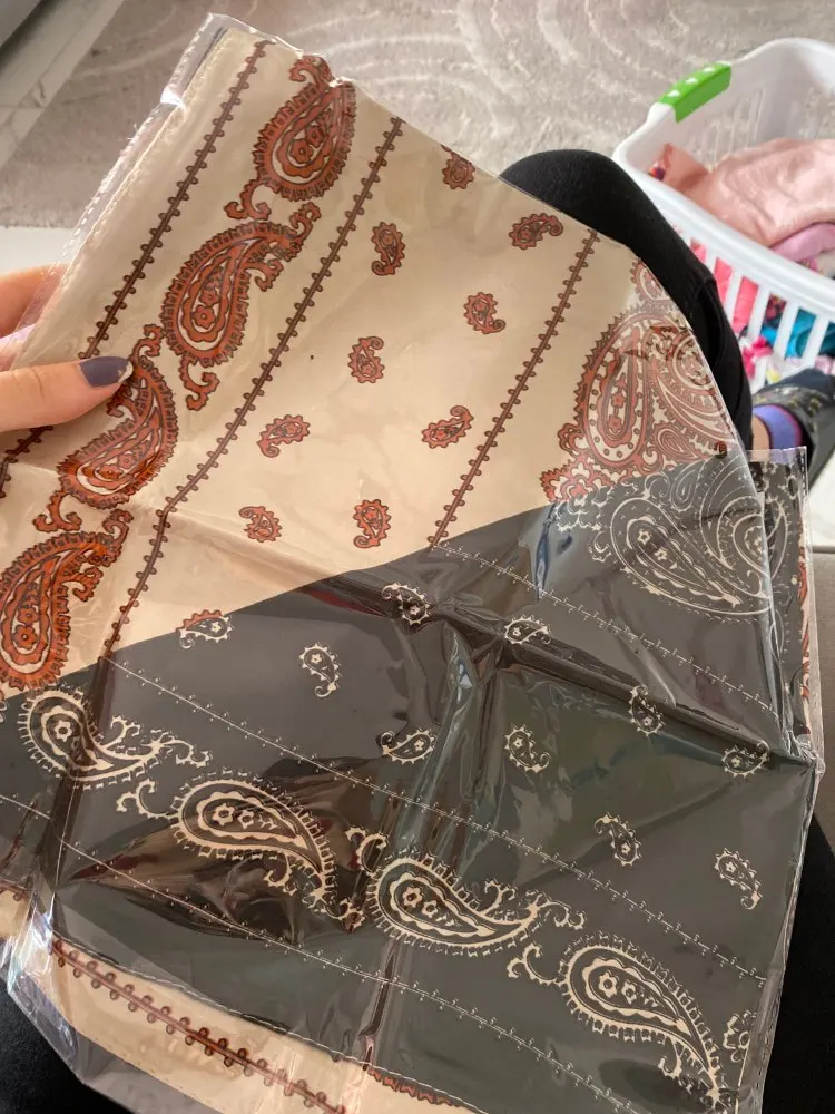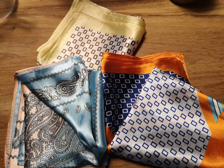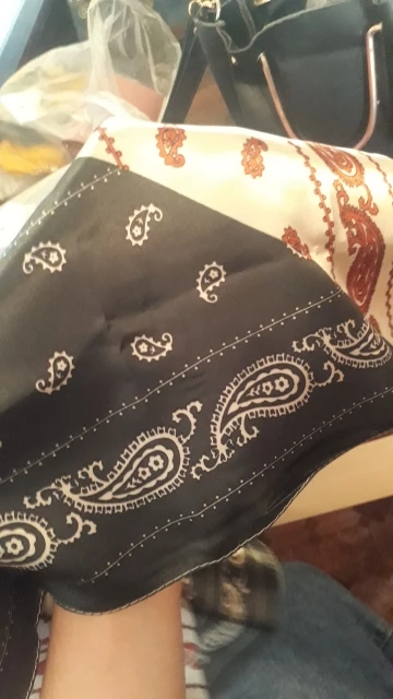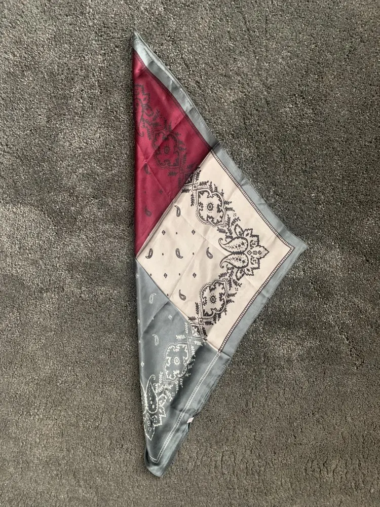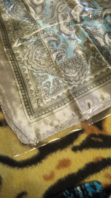 Рисунок размазанный, но за свою цену хорошие косынки. Трудно понять по фото, какого они цвета, но мне подошли те цвета, что пришли. Цвет С оказался с синим рисунком на белом фоне, а не с чёрным. Вторая половина ближе к тёплому красному. Цвет D - тёмный холодный зелёный, а не чёрный, как кажется на фото.
