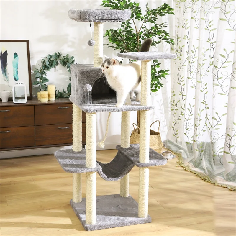 Бесплатная доставка, 5 уровней, платформа для кошек, с полностью царапающимися столбами, гамак, мягкий Окунь и свисающий шар