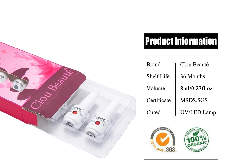 Бренд: Clou BeauteМатериалы: УФ отверждаемая смолаОбъем: 8 мл/0,27 унцийВес нетто: 30 гСертификация: MSDS, SGSИнструменты для отверждения: УФ-лампа светодиодный ная лампа, УФ/светодиодный ная лампа CCFLКачество-наш первый приоритет.Гели сохраняют блеск до 30 дней.Наиболее популярные цвета на выбор.Подходит на все случаи жизни.