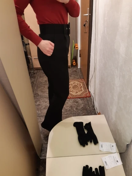 Брюки просто отличные, пошив качественный, ткань приятная, высокая посадка!!! На ОТ-78 ОБ-104 30 размер самое то. Единственное - ремень какой-то картонный, думаю долго не прослужит,но это ерунда. Брюки советую, буду покупать ещё!