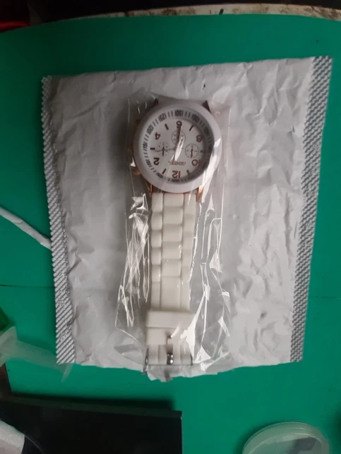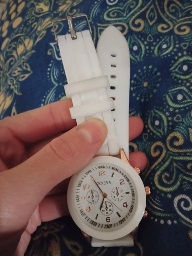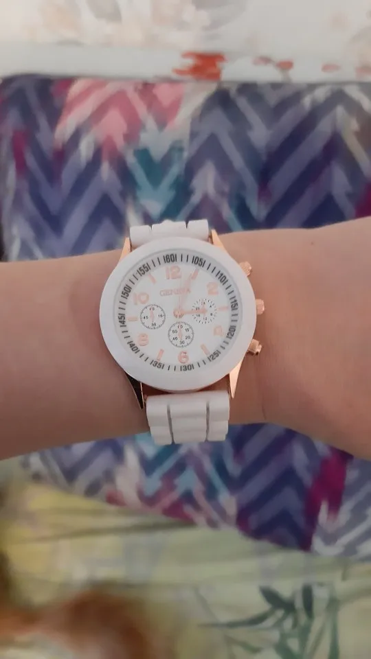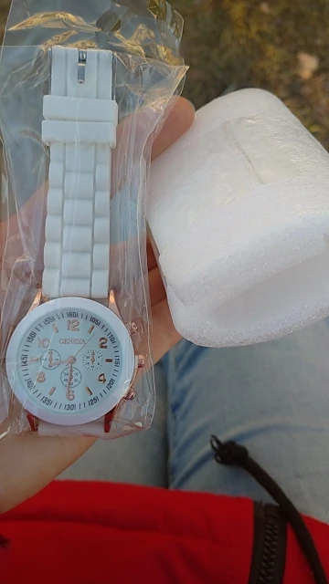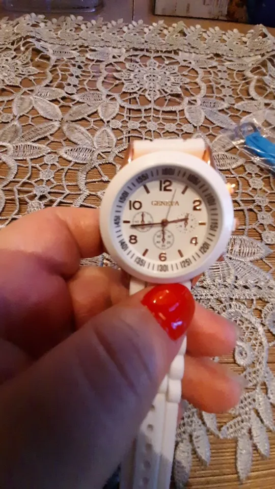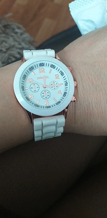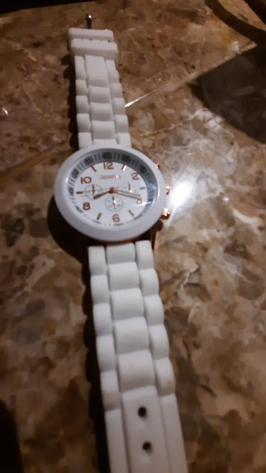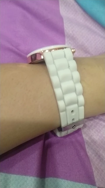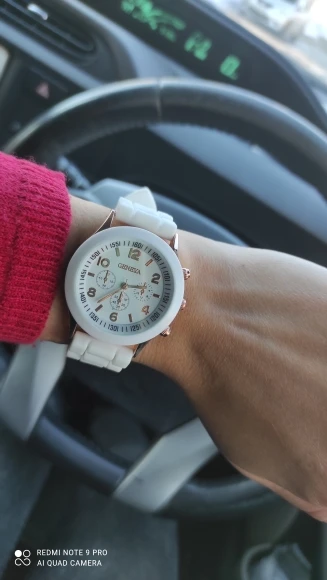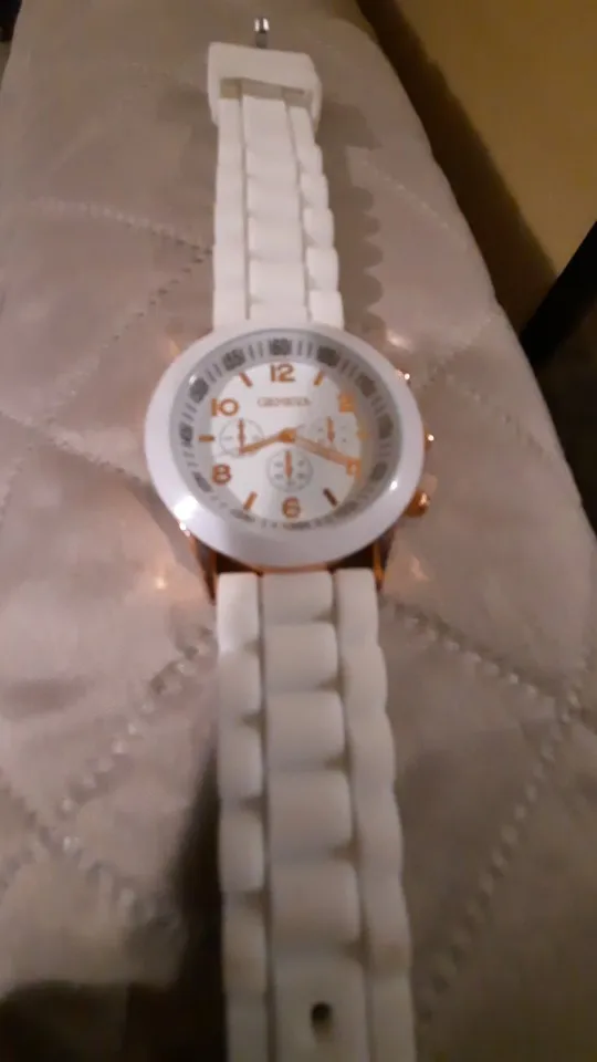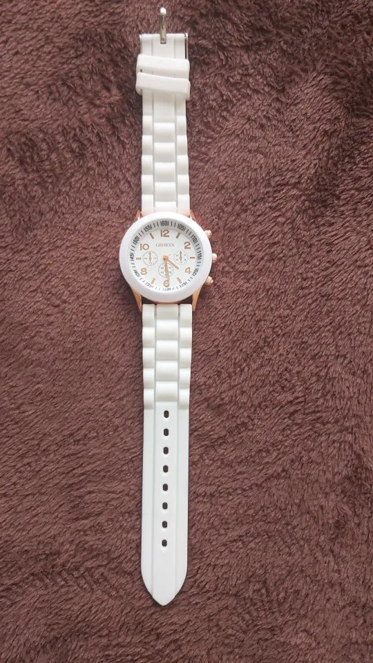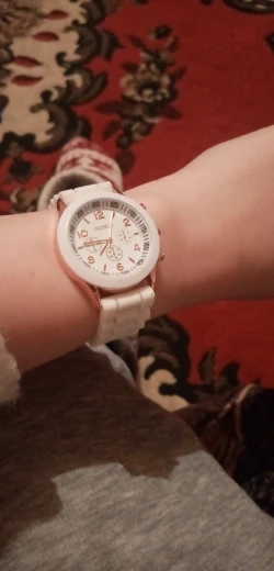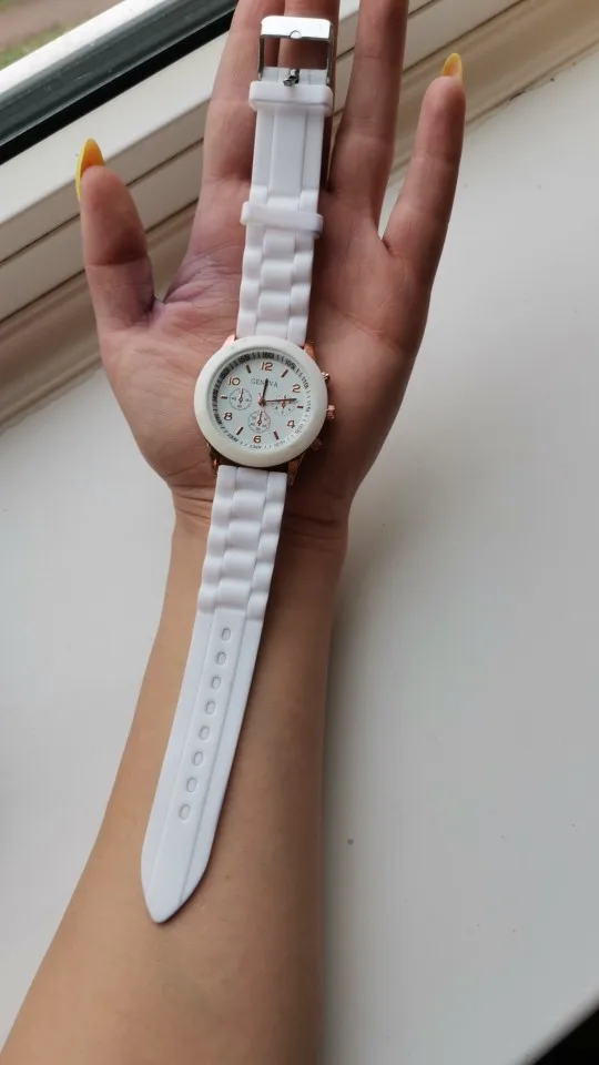 Часики пришли 1,5 месяца ждала и вот дождалась. Ремешок резиновый, цвет белый, циферблат хороший, часики тикают. Стояла заглушка, убрала и пошли. Купила за 149руб