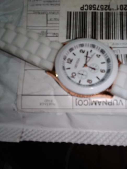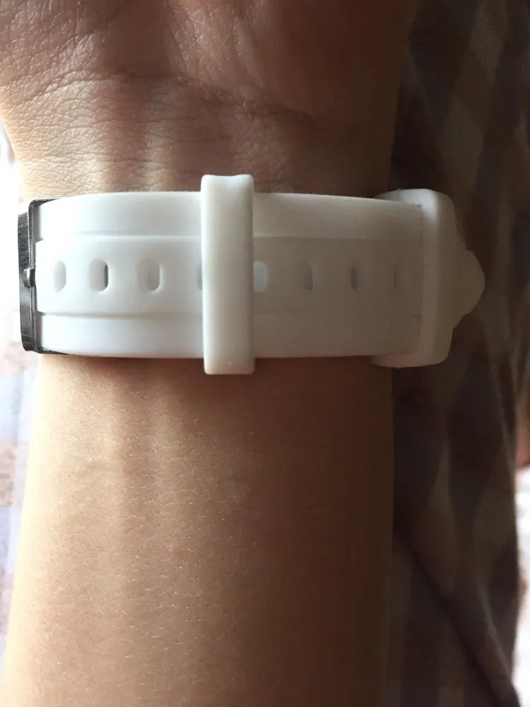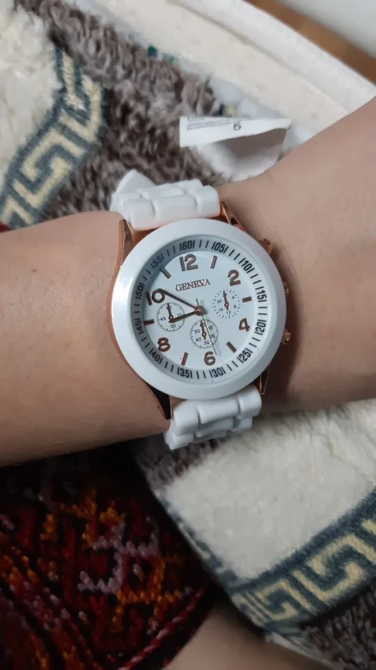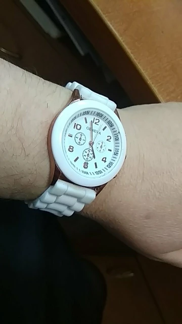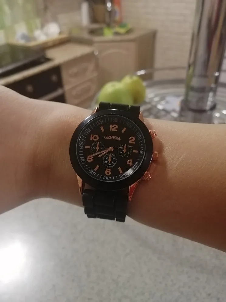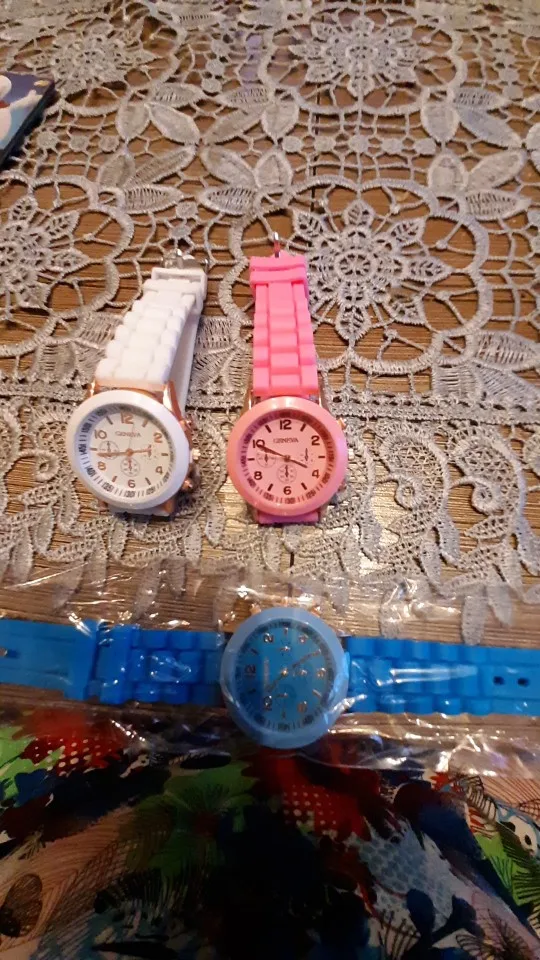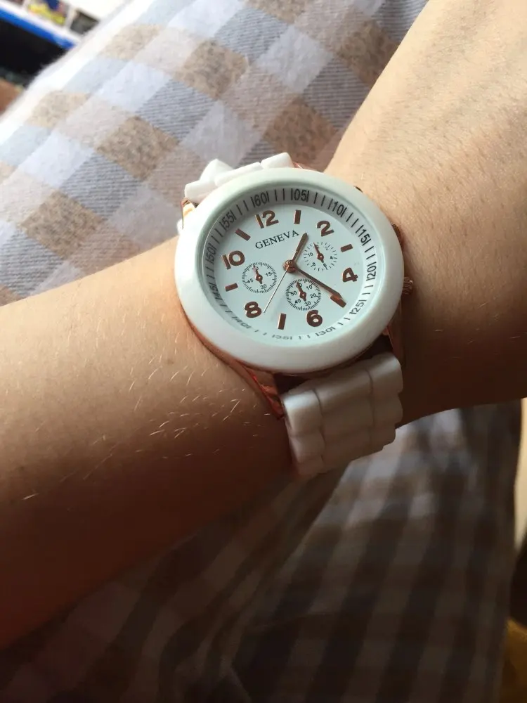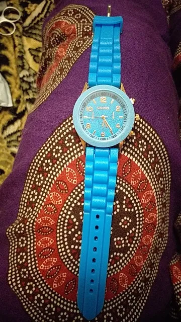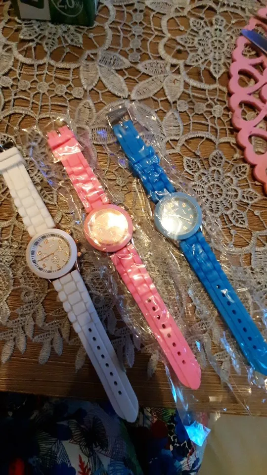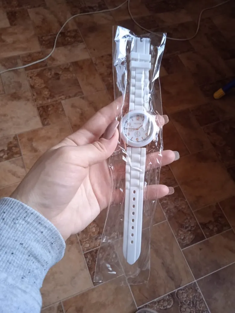 Часики пришли 1,5 месяца ждала и вот дождалась. Ремешок резиновый, цвет белый, циферблат хороший, часики тикают. Стояла заглушка, убрала и пошли. Купила за 149руб