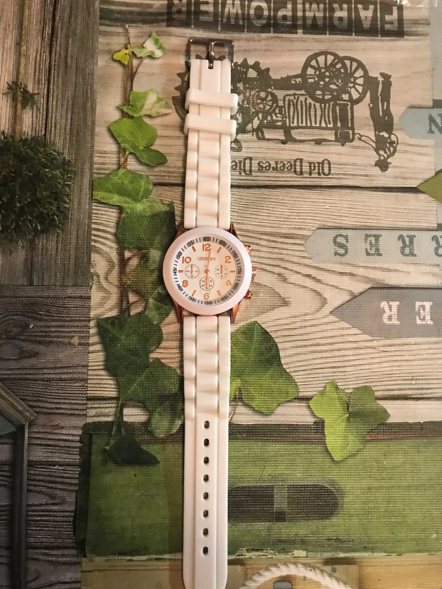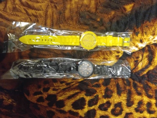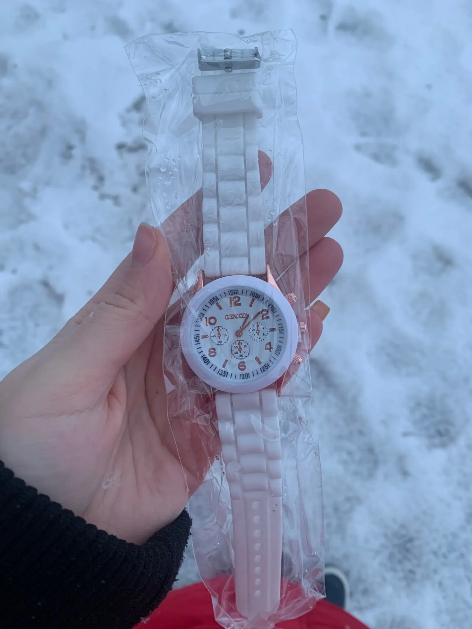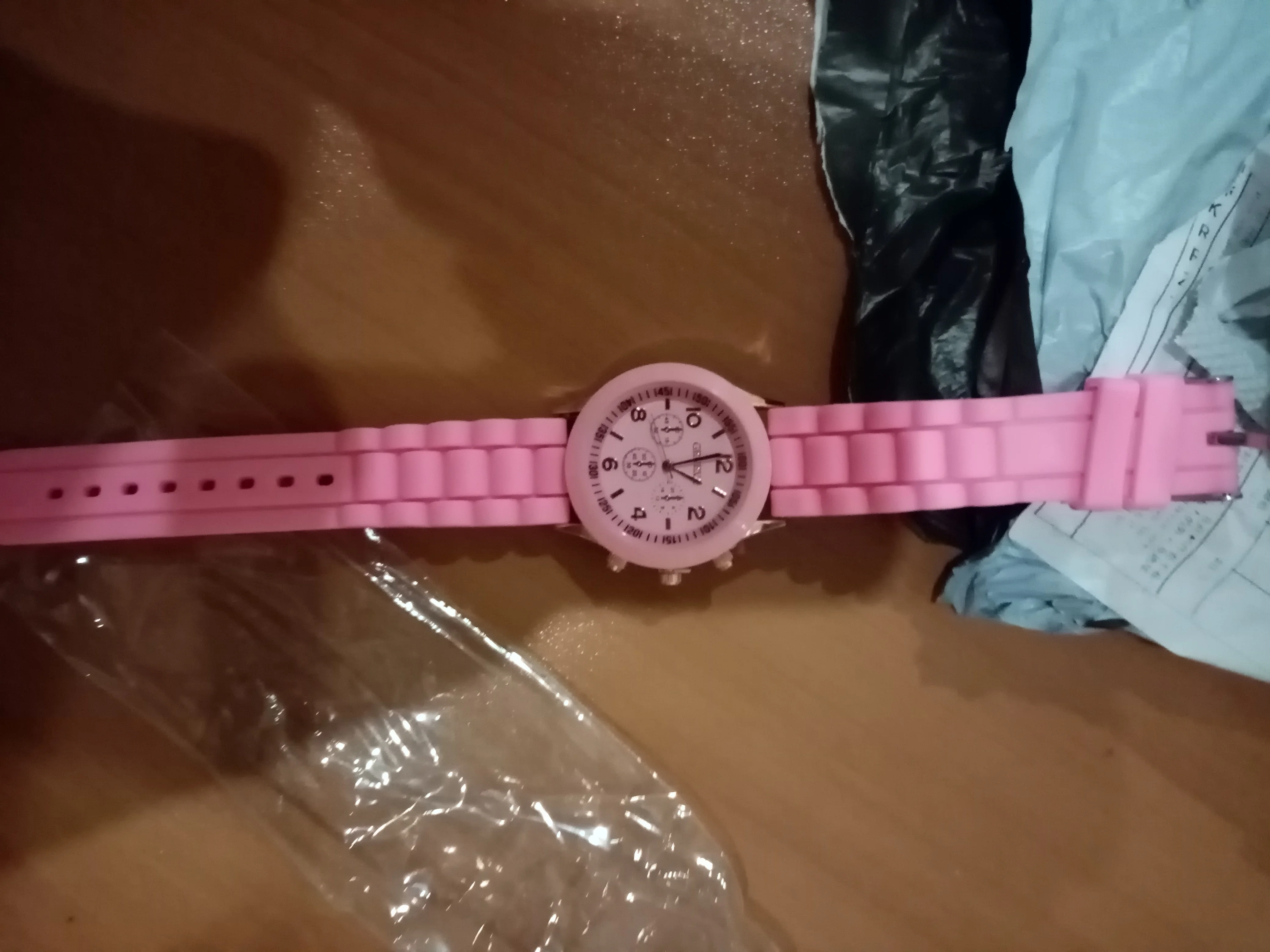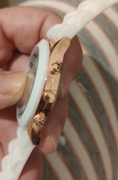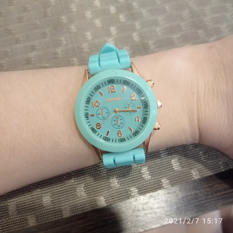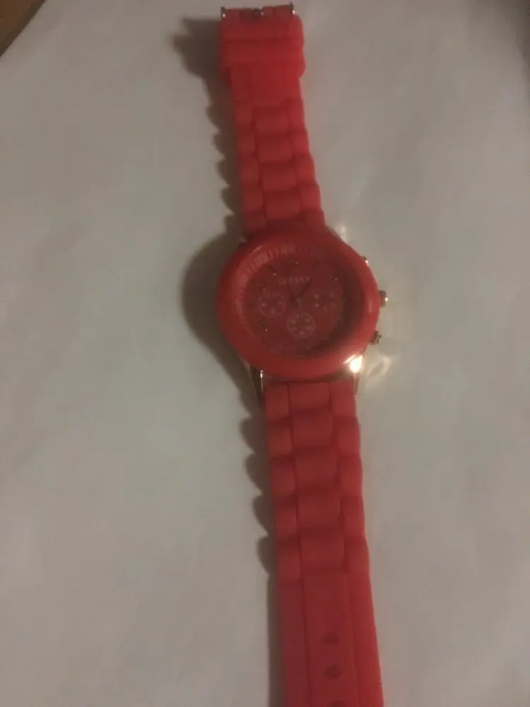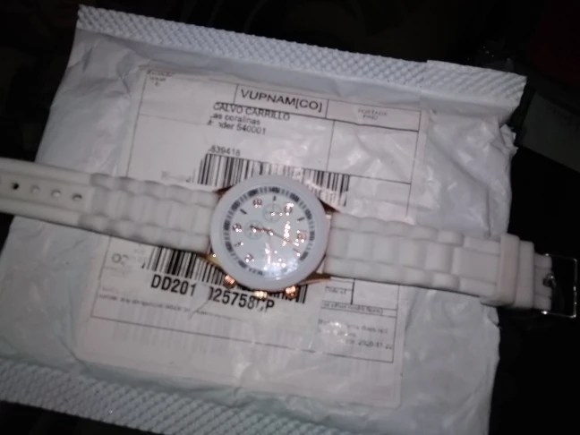 Часики пришли 1,5 месяца ждала и вот дождалась. Ремешок резиновый, цвет белый, циферблат хороший, часики тикают. Стояла заглушка, убрала и пошли. Купила за 149руб