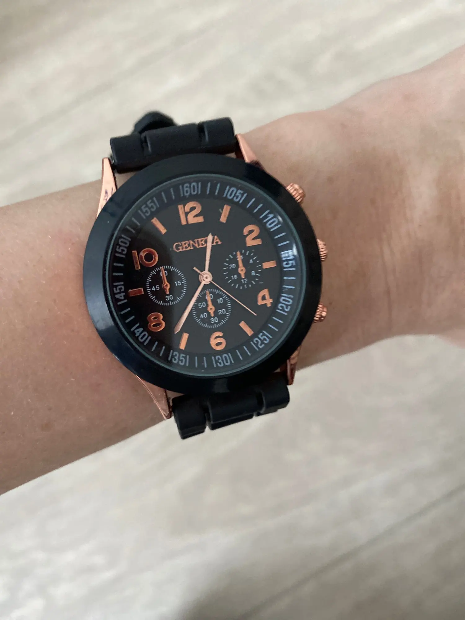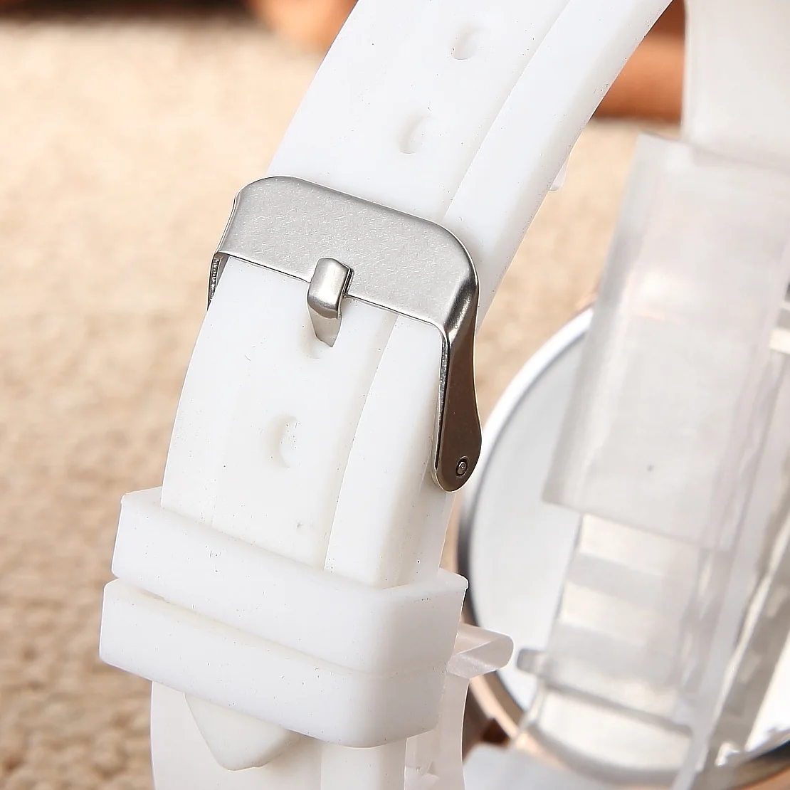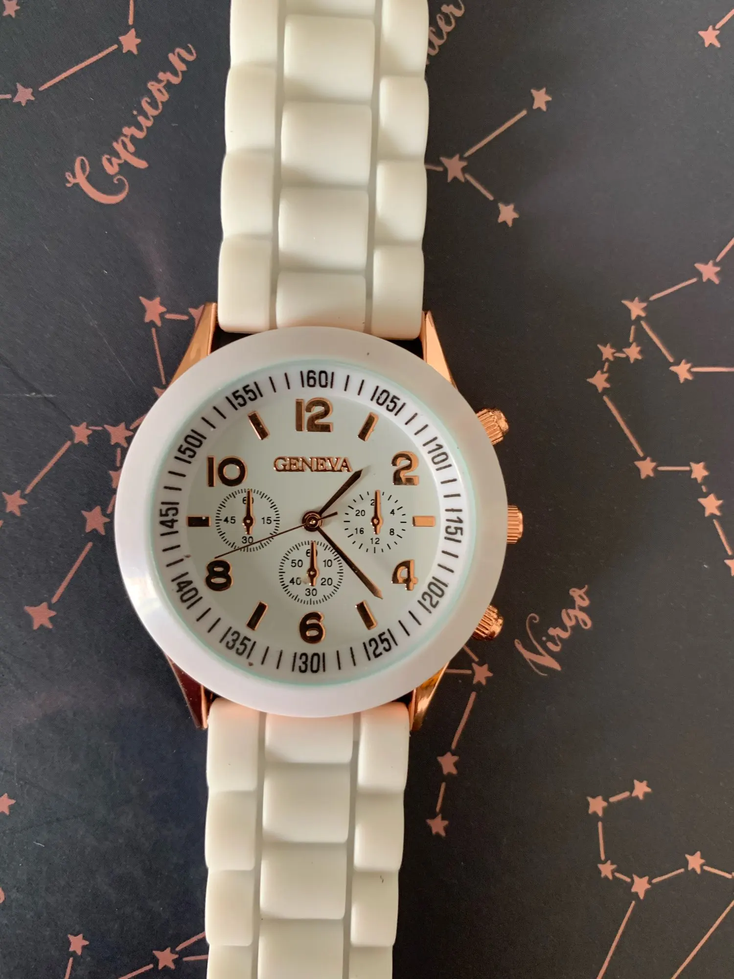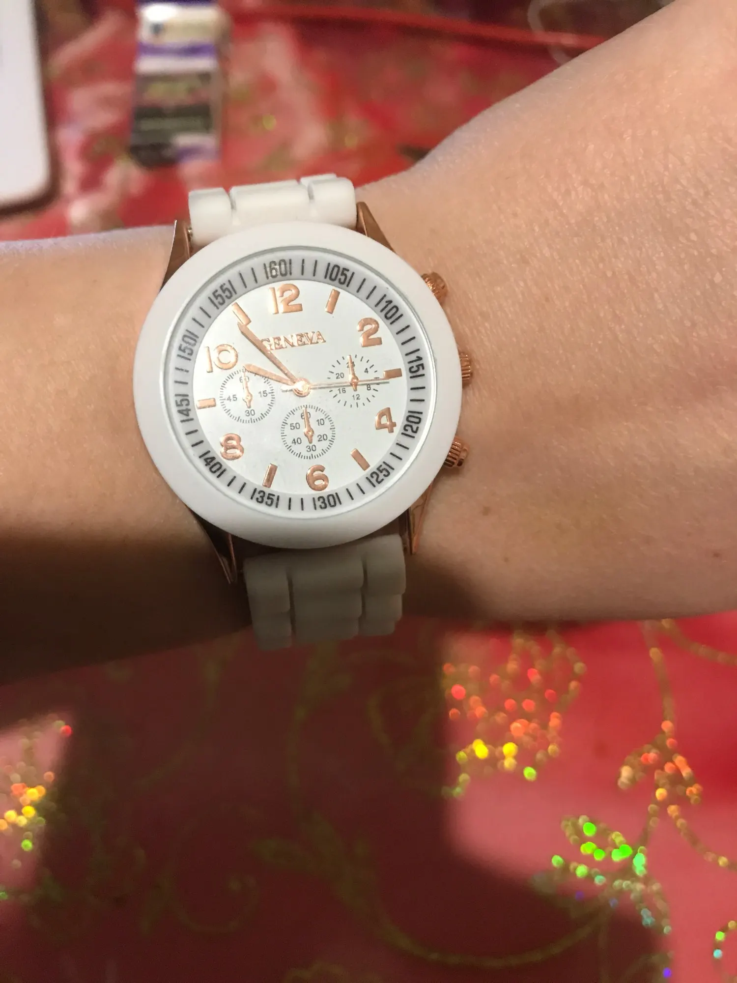Часики пришли 1,5 месяца ждала и вот дождалась. Ремешок резиновый, цвет белый, циферблат хороший, часики тикают. Стояла заглушка, убрала и пошли. Купила за 149руб