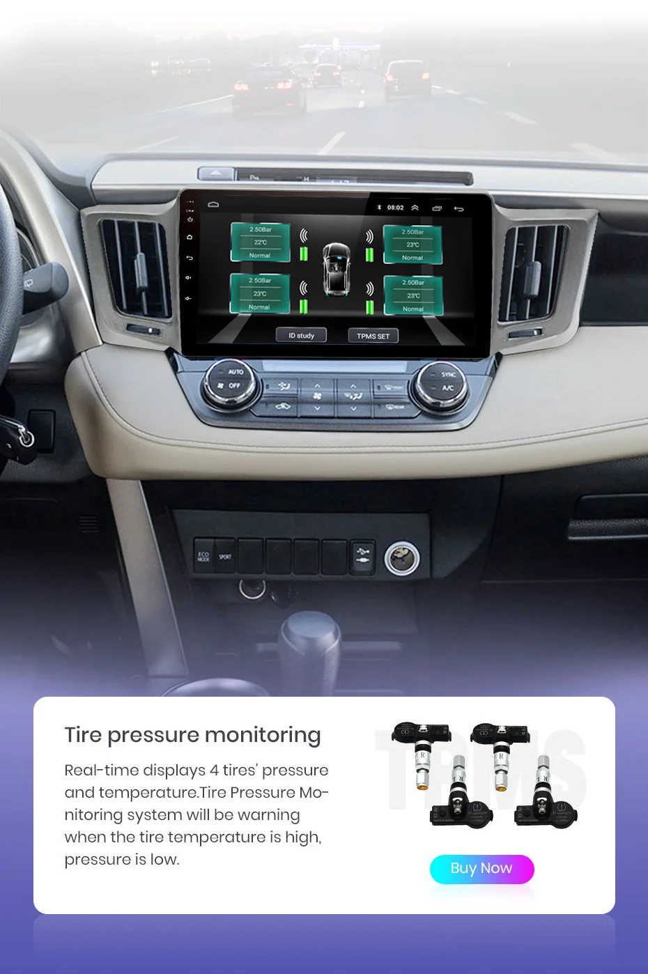 В режиме реального времени отображает давление и температуру в 4 шинах, при превышении предельного давления или температуры в шинах немедленно срабатывает сигнал тревоги.