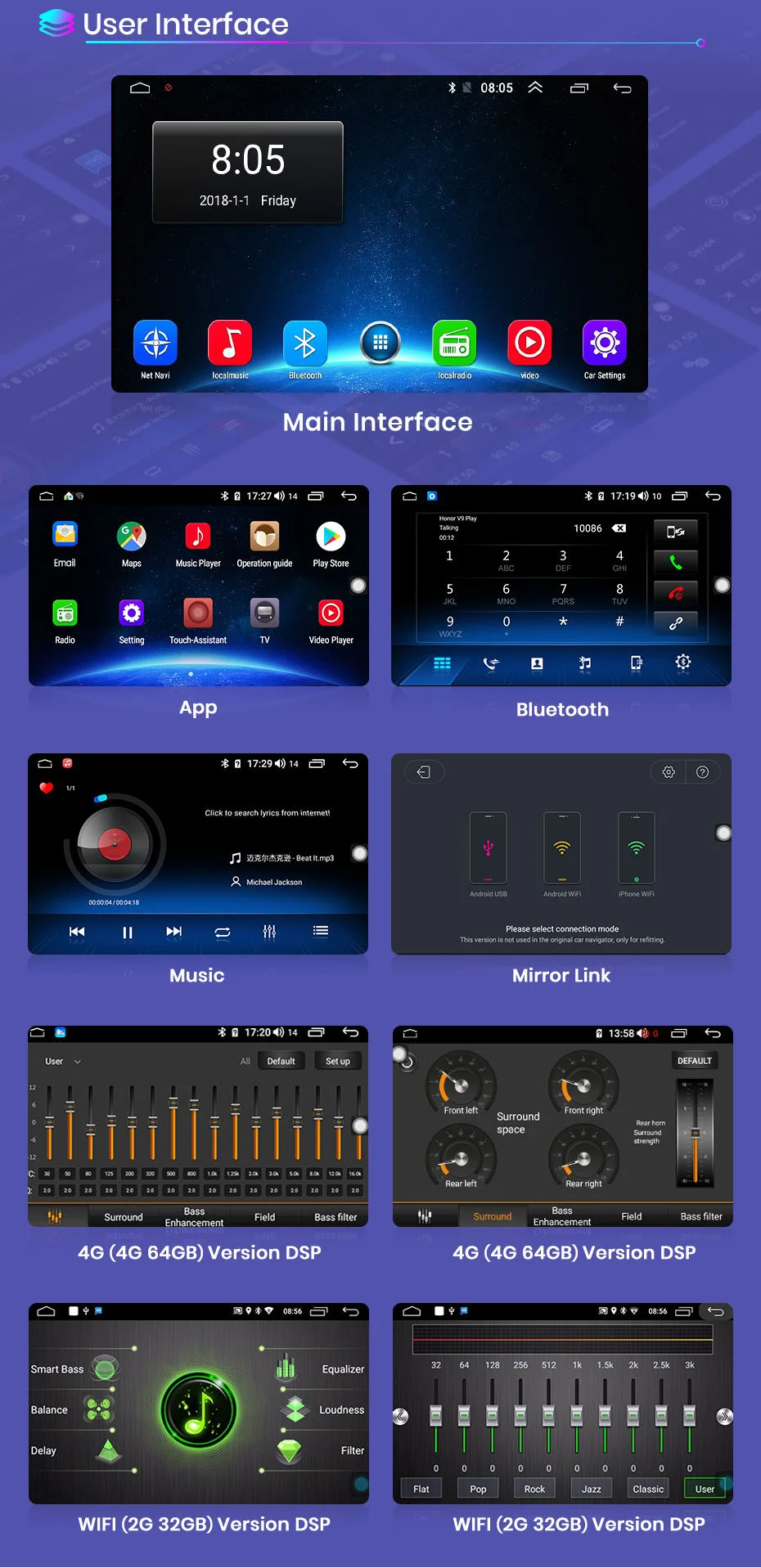 Special FeatureBuilt-In Microphone,4G Network,Wifi Function ,Steering Wheel Control