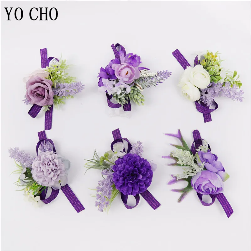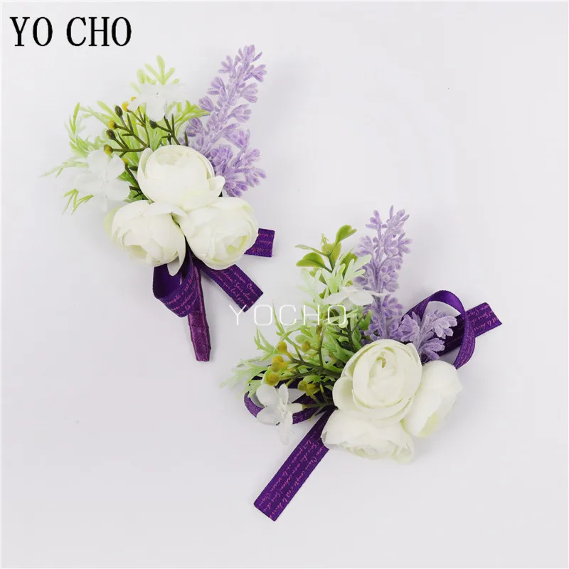 YO CHO, Свадебный корсаж, бутоньерка для жениха, белая фиолетовая Шелковая Роза, Мужская Брошь для свадьбы, подружки невесты, браслет на запястье, корсаж, цветок