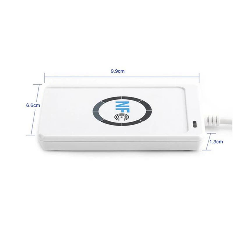 Особенности:1.CCID-совместимый2. ПК/SC-совместимый3. Скорость чтения/записи до 424 кбит/с4. Встроенная антенна для бесконтактного доступа к бирке, с расстоянием считывания карт до 50 мм (в зависимости от типа бирки)5. Поддерживает ISO 14443 Type A и B, FeliCa и все 4 типа s тегов NFC (ISO/IEC 18092)6. Поддерживает Новый сверхлегкий C (с помощью pseudo APDUs) и Plus SL1 (4 байта UID, с помощью pseudo APDUS) и SL37. Поддерживает все 3 режима NFC: ридер, эмуляция карт и одноранговые режимы8. Встроенная функция предотвращения столкновений (по крайней мере, 1 карта обнаруживается при наличии нескольких карт)9.USB PnP10. Двухцветный светодиодный управляемый пользователемПрименение:1. Контроль доступа к сети2. Микрооплата3. Мобильный тег NFC4. Терминалы общественного транспорта5. Автоматический Сбор тарифов6. Физический контроль доступа7. Лояльность клиентовВремя и посещаемостьБесконтактные общественные телефоныТорговые автоматыТехнические характеристики:Интерфейс: USB Полная скоростьРабочее расстояние:<= 50 мм (зависит от типа бирки)Напряжение питания: 5 В постоянного токаТок подачи: 200 мА (рабочий); 50 мА (в режиме ожидания); 100 мА (нормальный)Рабочая температура: 0-50CРабочая частота: 13,56 МГцПоддержка интерфейса смарт-карты: ISO14443 Тип A и BMif FeliCa4 типа тегов NFC (ISO/IEC18092)Соответствие/сертификатыПК/SC, CCID, CE, FCC, VCCI, RoHS совместимый, USB Полная скоростьMicrosoft WHQL: 2000, сервер 2003, XP, Vista, сервер 2008, сервер 2008 R2, 7Поддержка операционной системы: Win 98, Win ME, Win 2000, Win XP, Win Vista, Win 7, Win сервер 2003, Win сервер 2008Win XP x64, Win Vista x64, Win 7x64, Win сервер 2003x64, Win сервер 2008x64, Win сервер 2008 R2 x64Windows CE 5,0LinuxMacУпаковка:1x ACR122U NFC кард-ридер10x UID сменные карты1x Драйвер и SDK (загрузка с acs.com.hk)1x M1/UID клон программного обеспечения (свяжитесь с продавцом, если необходимо)