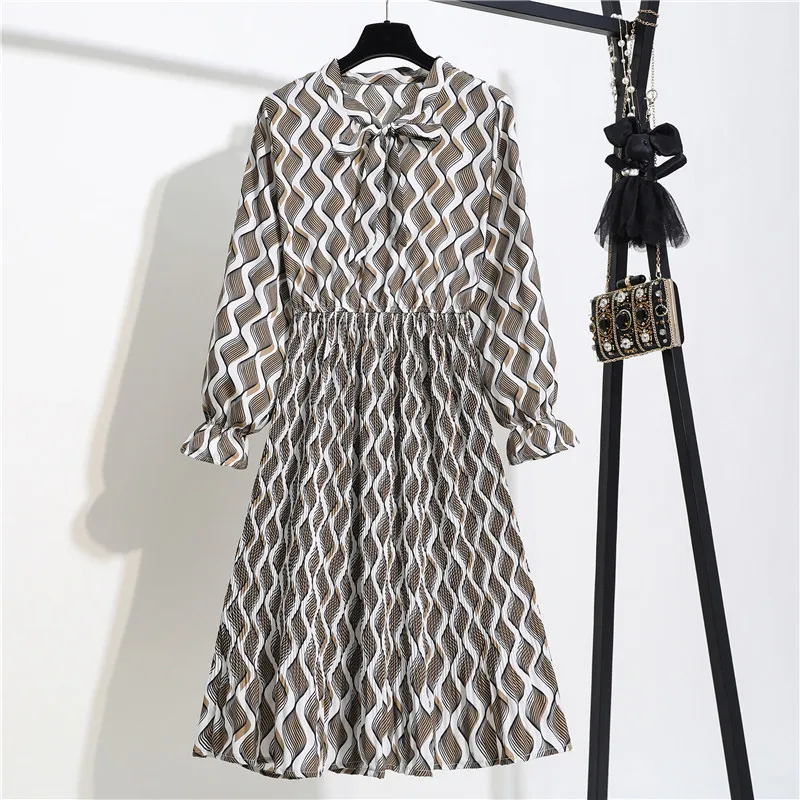 Шикарное платье с цветочным принтом и длинным рукавом, женское повседневное шифоновое платье-миди трапеция в Корейском стиле с бантом на воротнике