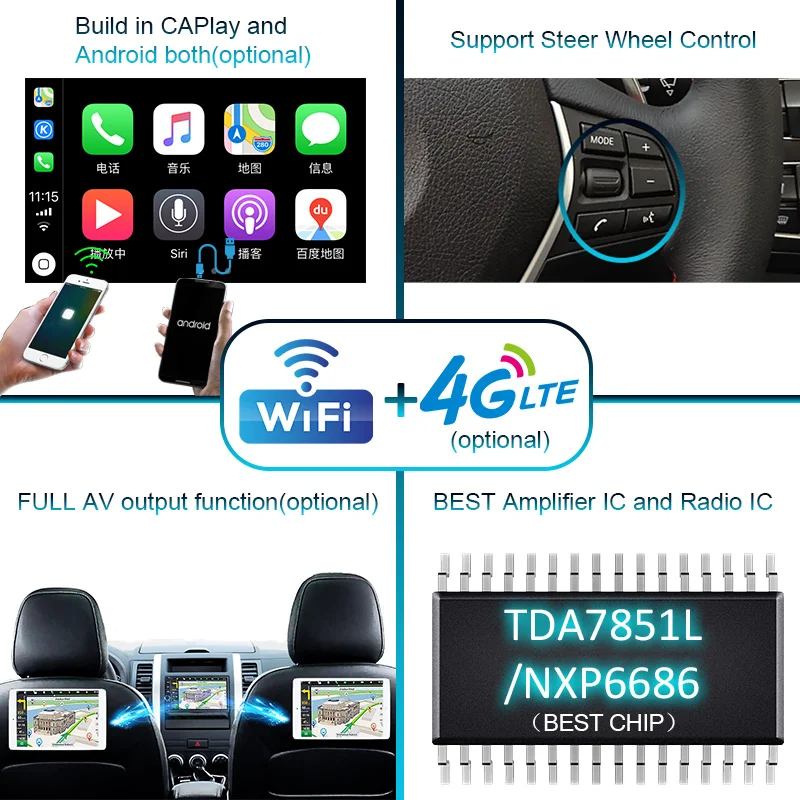 ЧипыРадио использует лучшие радио chip-NXP6686 и лучший усилитель chip-TDA7851L.Чип NXP6686 является лучшим радиочипом, и лучше than7708,6851 и любой другой радиочип. Это лучший радиочип на рынке в настоящее время. Хороший радиочип делает радиосигнал более сильным.TDA7851L является лучшим амплитудным IC на рынке в настоящее время. Лучше, чем 7388, и все остальные. Это делает качество звука автомобиля лучше, чем у других типов радио. Если вам нужно лучшее качество звука, мы предлагаем вам также выбрать функцию DSP, DSP-это система цифрового усилителя, которая предлагает лучшее качество звука.
