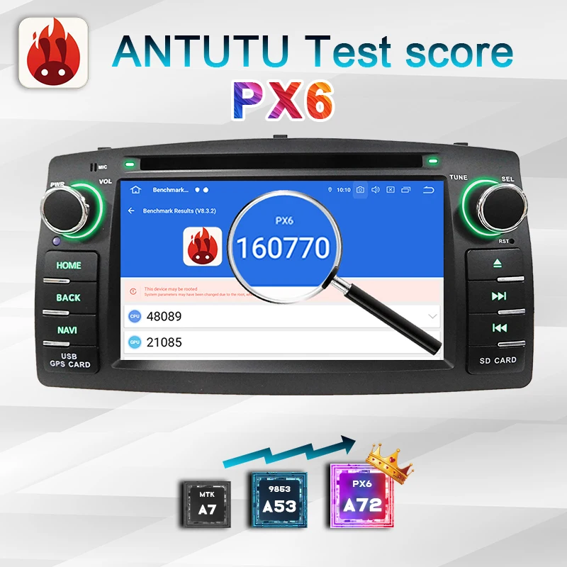 PX6PX6 является лучшим чипом на рынке в настоящее время, он работает быстрее, чем все другие типы. Балл ANTUTU составляет 160770, что лучше 9853 4G + 64G, PX5 и всех других типов 4 + 64G на рынке. По сравнению с другими радио типа fo, PX6 radio может загружать больше видов приложений android с android market, и приложение может работать лучше.