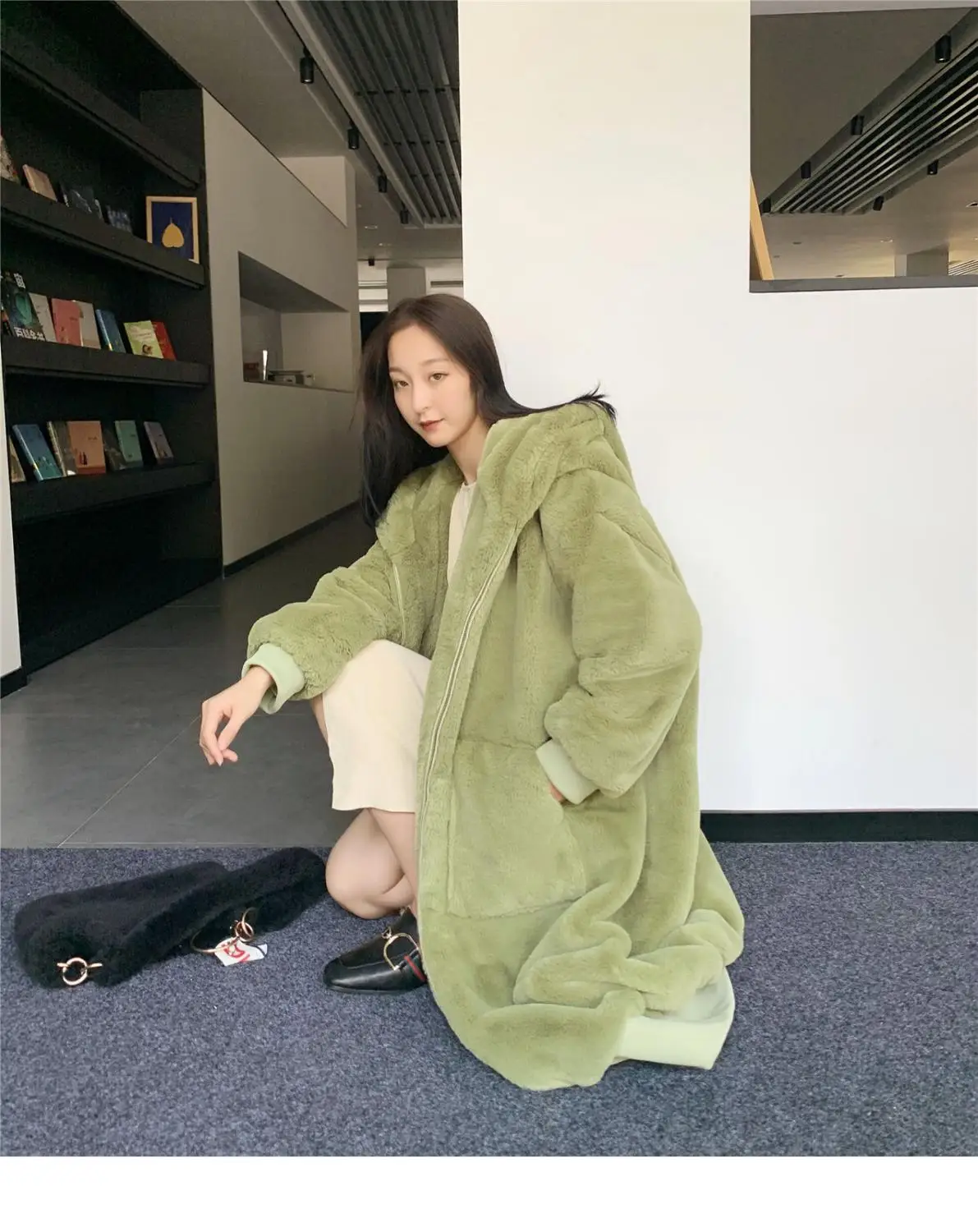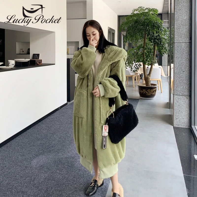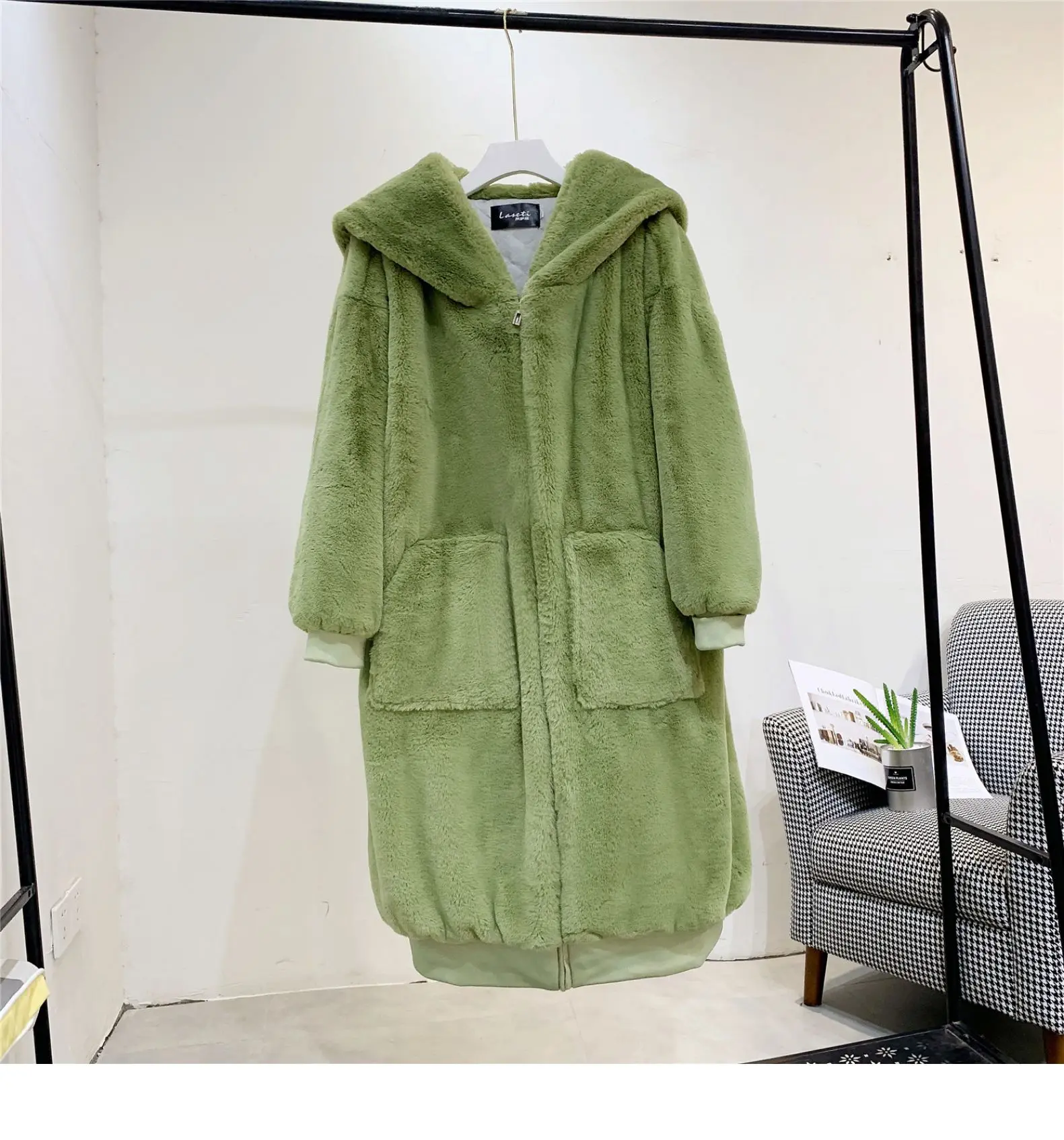 Женское зимнее однотонное меховое пальто с капюшоном, большие размеры, женская модная зеленая Толстая плюшевая куртка с большими карманами, теплые парки Jackes ZY18