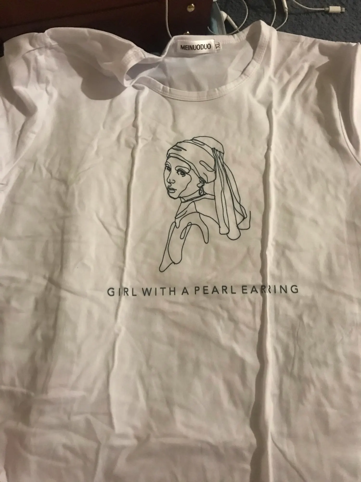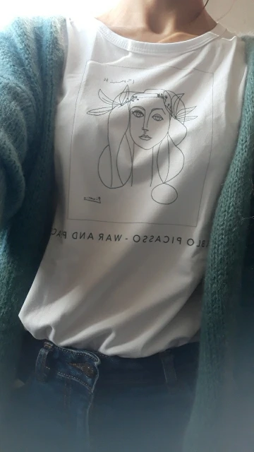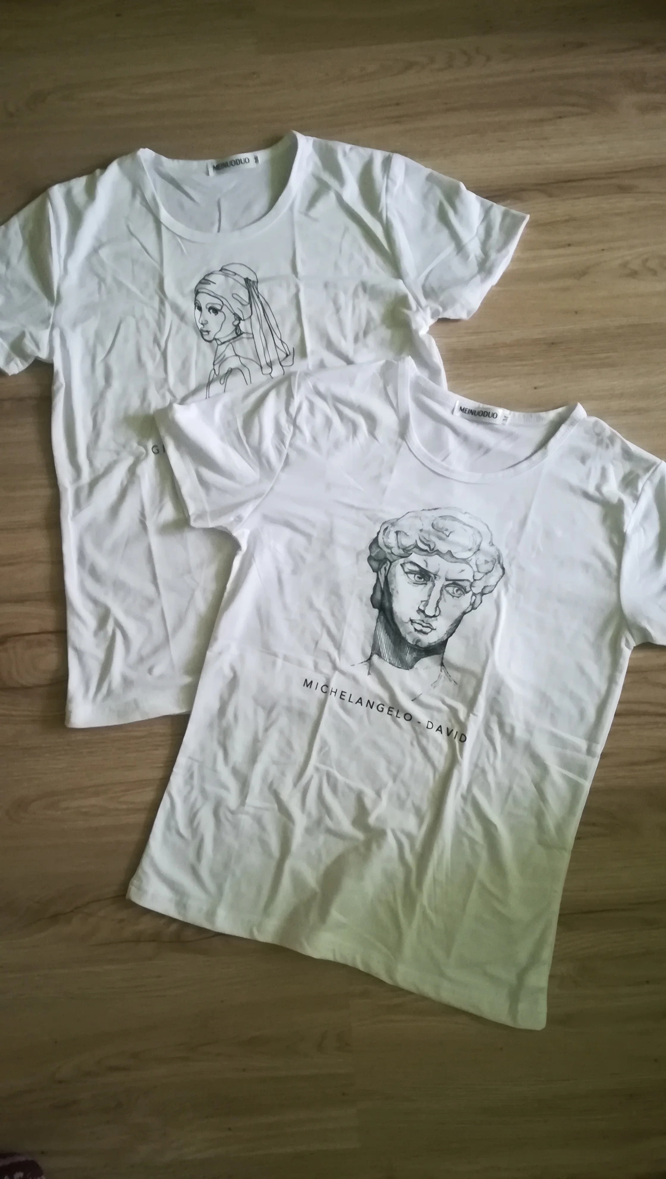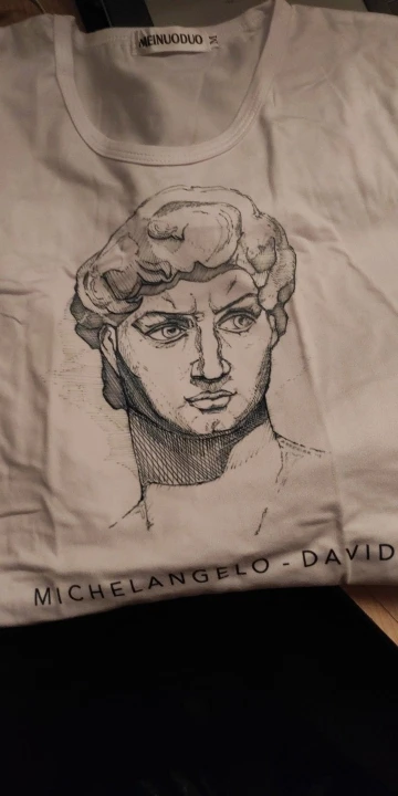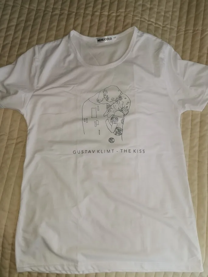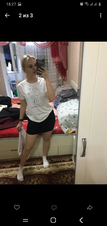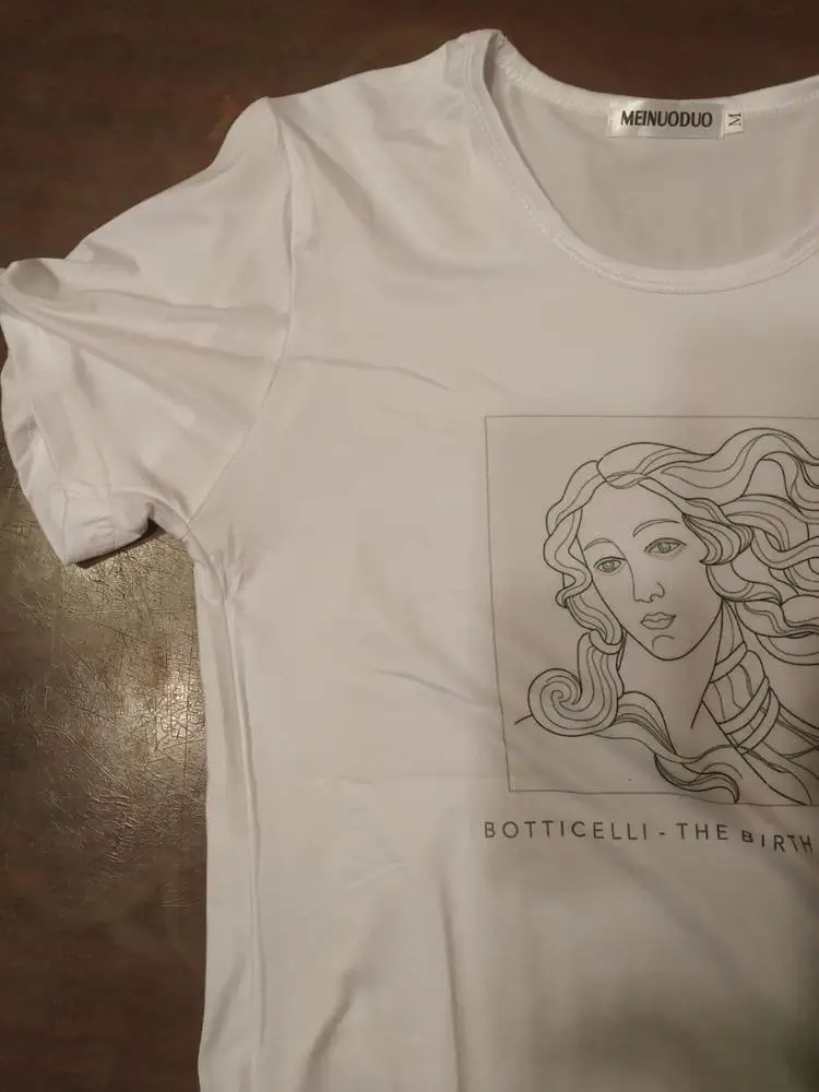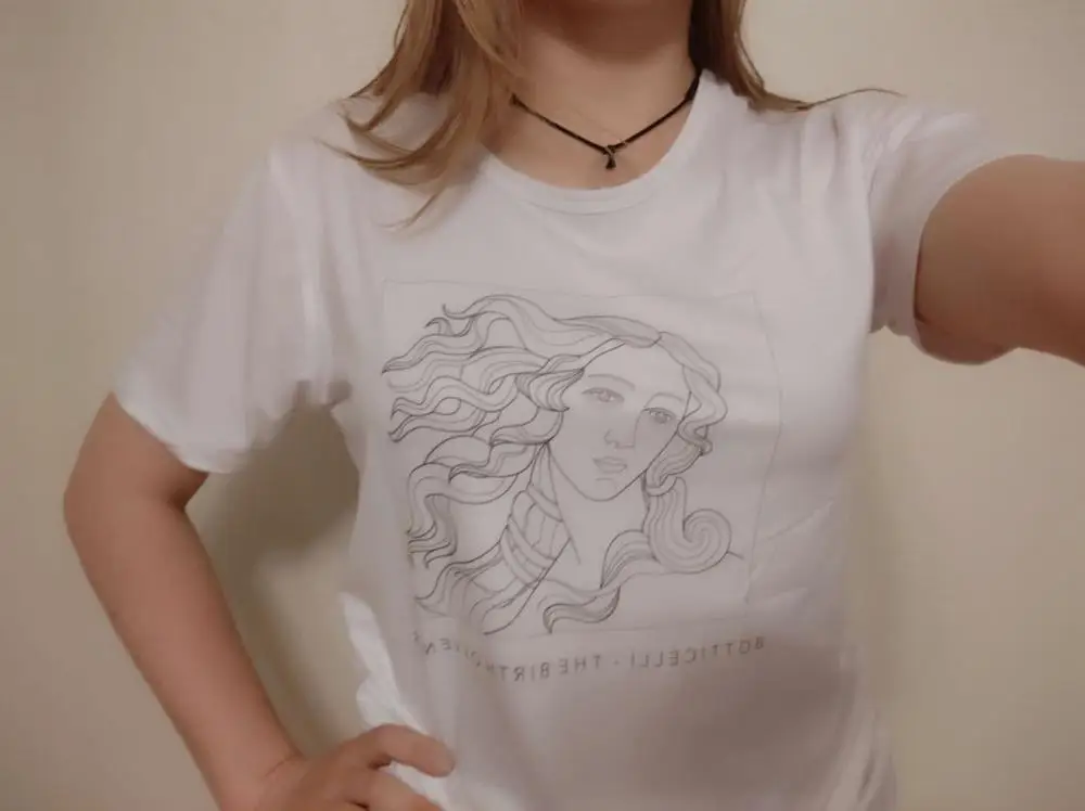 В общем, размер соответствует, доставлялось с 27 октября по 11 ноября. Вроде всё нормально, особенно для цены. 4 звезды потому что футболка, кажется, совсем не такого кроя, как на картинках и ещё она из очень тонкой ткани, поэтому если у вас есть какие-то "проблемные" места, то они в ней будут весьма заметны. Я заказала две: белую и с изображением Венеры, но на оба отзыва приложу одни и те же фотографии, потому что футболки по сути одинаковые.