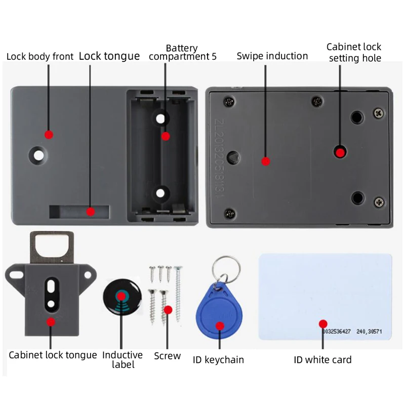 Особенность Практичный электрический индукционный дверной замок RFID, без перфорации, без механического ключа, работает от аккумулятора, для открытия карты. Он обеспечивает безопасность с чистым внешним видом, повышает безопасность детей в домашних условиях, не позволяет их детям свободно открывать ящики или дверцы шкафа. Этот RFID-замок для шкафчика программируется, запрограммируйте ключ в замки перед установкой. Подходит для различных типов деревянных шкафов, таких как мебельный замок, замок шкафчика, шкафчик и т. д.Описание: