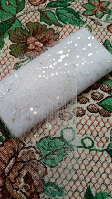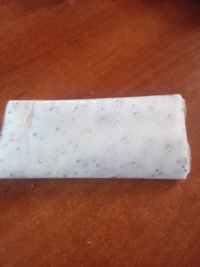 Очень красивый фатин с пайетками. Качественный, отрез ровный, намотка плотная (видимо фабричная). Упакован в плёнку. Пайетки приклеены хорошо, не отпадают.