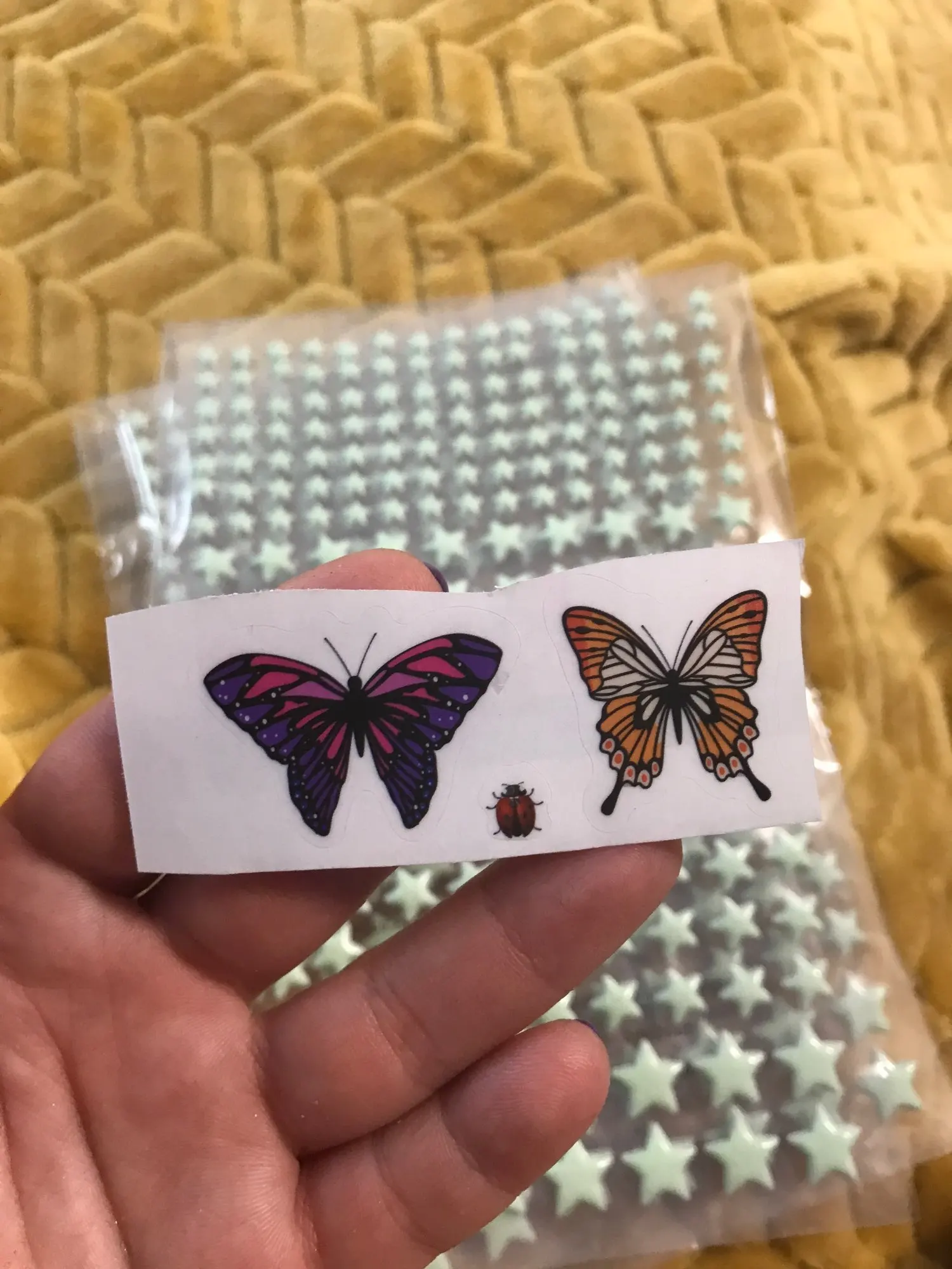 Наклейки классный, светятся аж до самого утра) на обоях держаться, но слабовато! Пока не отлетели, а вот на потолке приклеились насмерть)))) если только со штукатуркой отвалятся))) доставка суперрр быстрая. Рекомендую оооочень)) мы ещё партию заказали)))