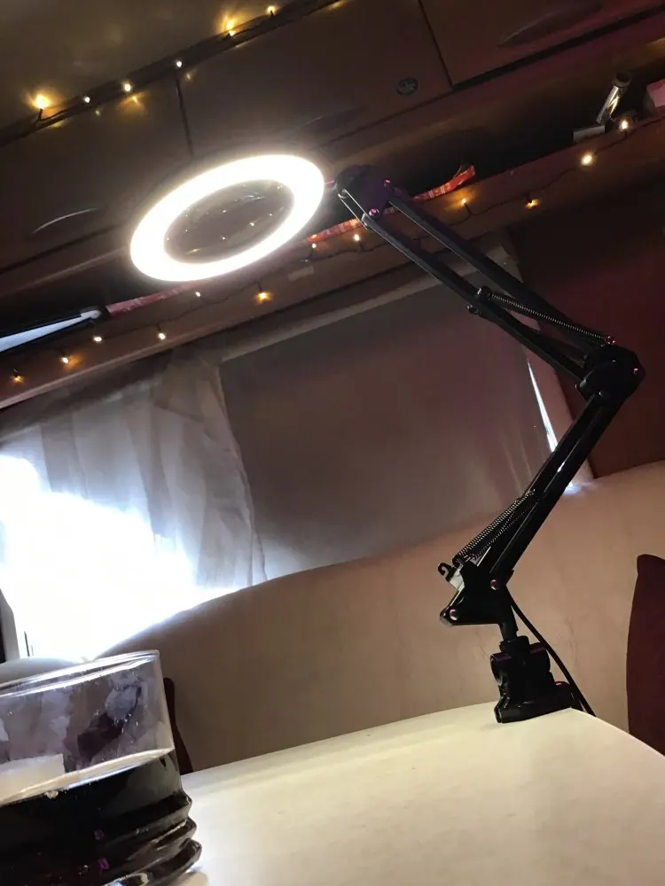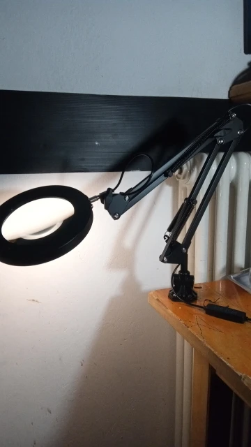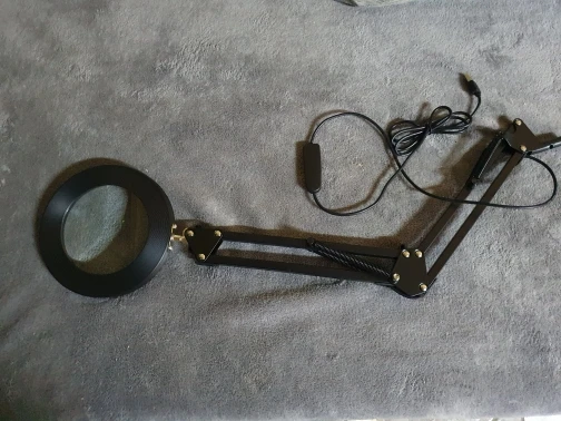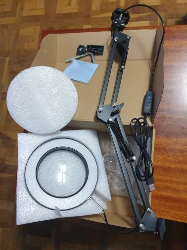 Неплохая лампа. Доставка достаточно медленная. Упаковка могла быть лучше, приехала несколько помятой, но лампа целая. Лупа большая это хорошо, но тяжёлая из-за этого струбцина держит плохо. Зарядка для питания нужна мощная, далеко не все могут включить лампу, даже если и на них указано 5в 2А, если плохая зарядка лампа может моргать, а не гореть, но и светит ярко и хорошо регулируется.