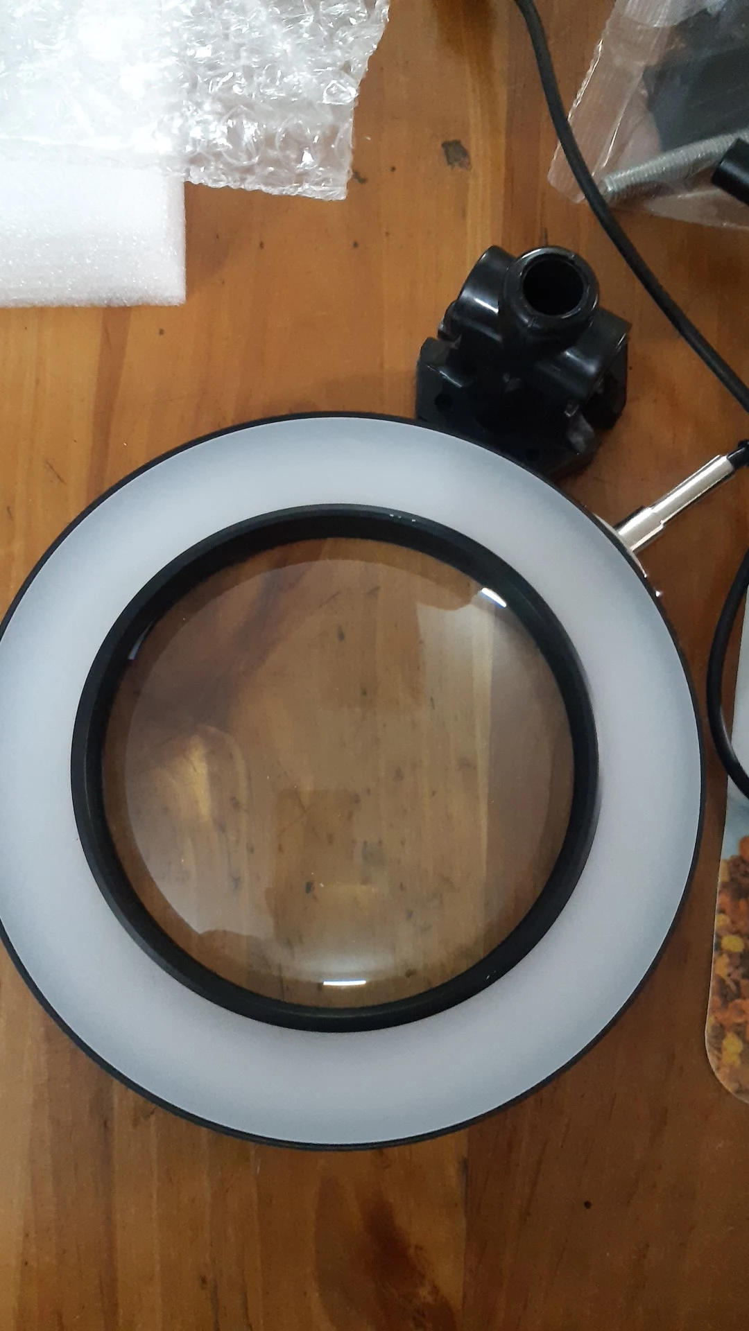 Пришло целым. Доставлено курьером. Яркости чуть не хватает (для пайки) Струбцина действительно заваливается на бок почему-то. Возможно от слишком толстой мягкой прокладки, т.к. на вид сама струбцина вполне добротная. Увеличение линзы вроде как соответствует заявленному, правда сравнивал с другой китайской лупой))