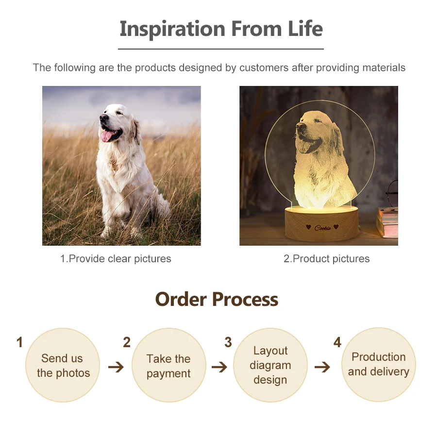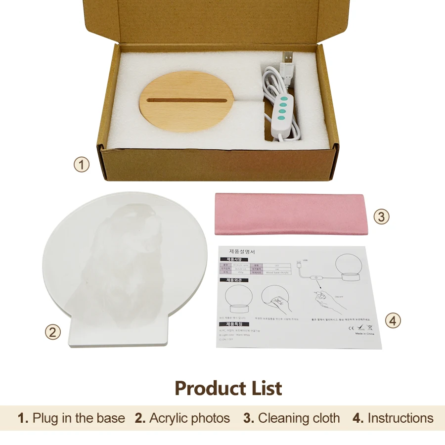 malgré le temps d’attente très long je recommande ce produit il est possible de graver ou non sur le socle en bois ce que vous voulez , il est possible de changer d’intensité de luminosité et de changer de couleur.