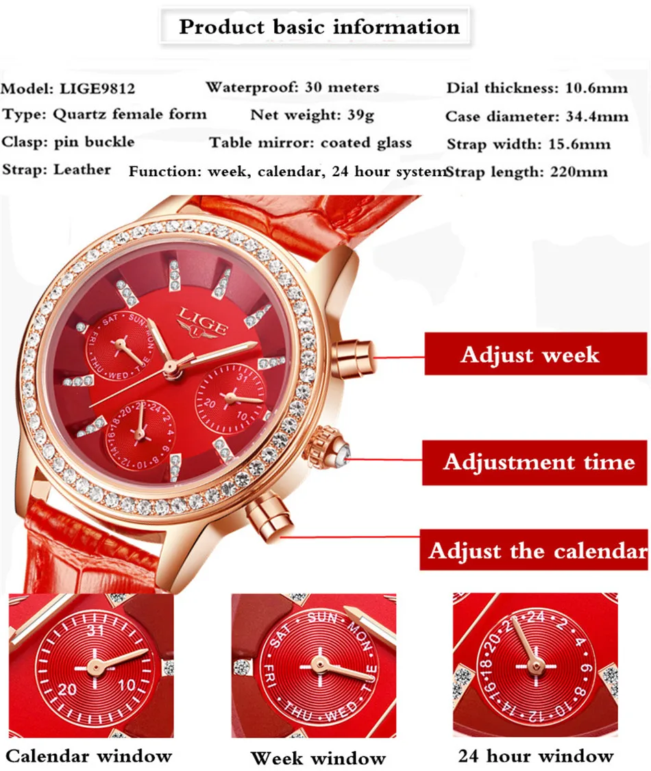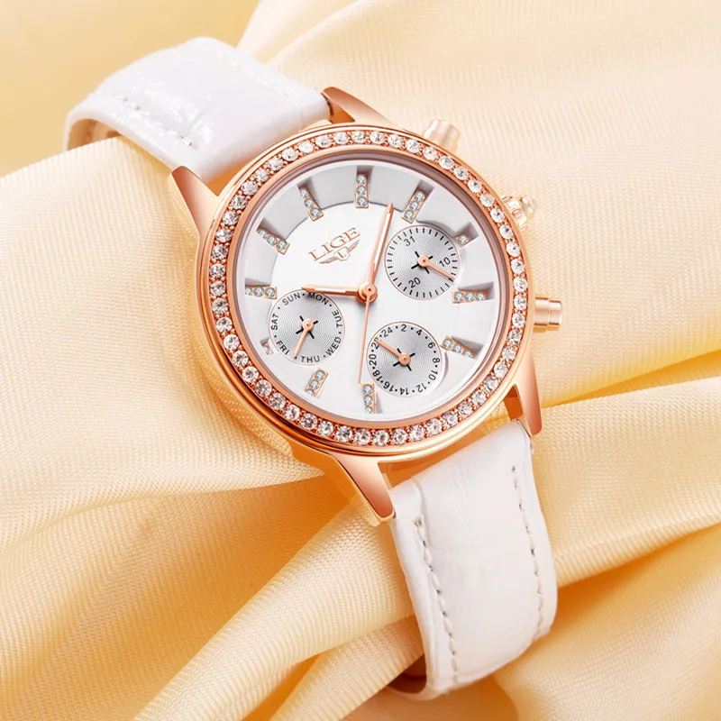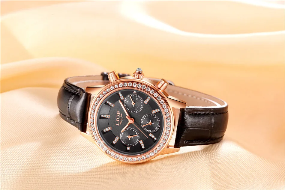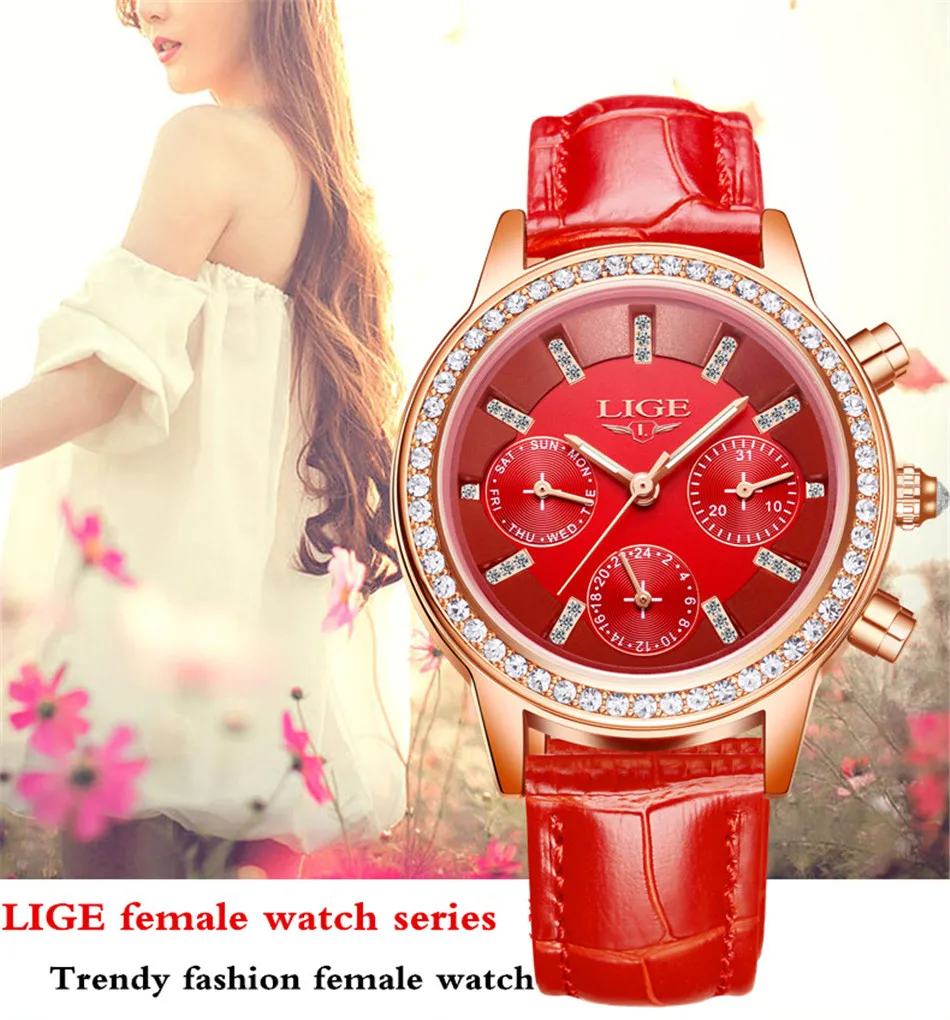 Часы наручные LIGE женские кварцевые, роскошные Брендовые повседневные наручные, с кожаным ремешком