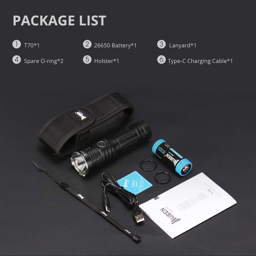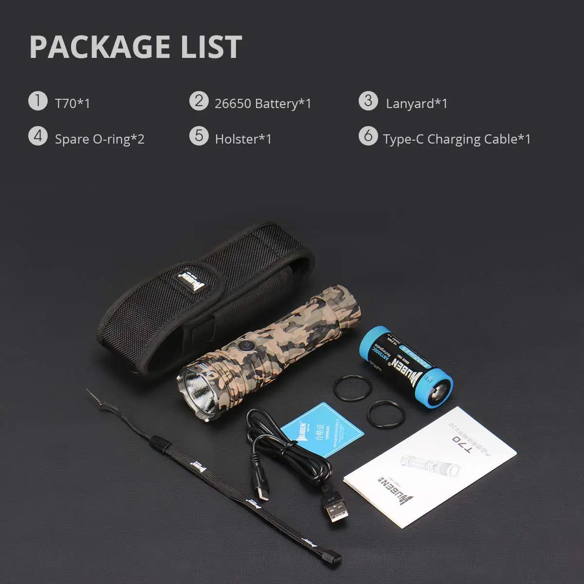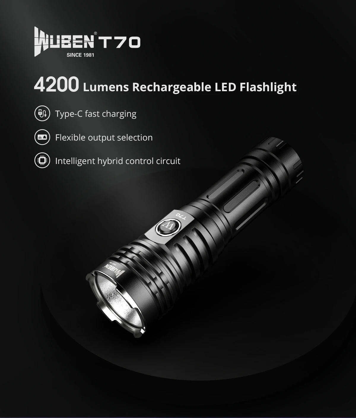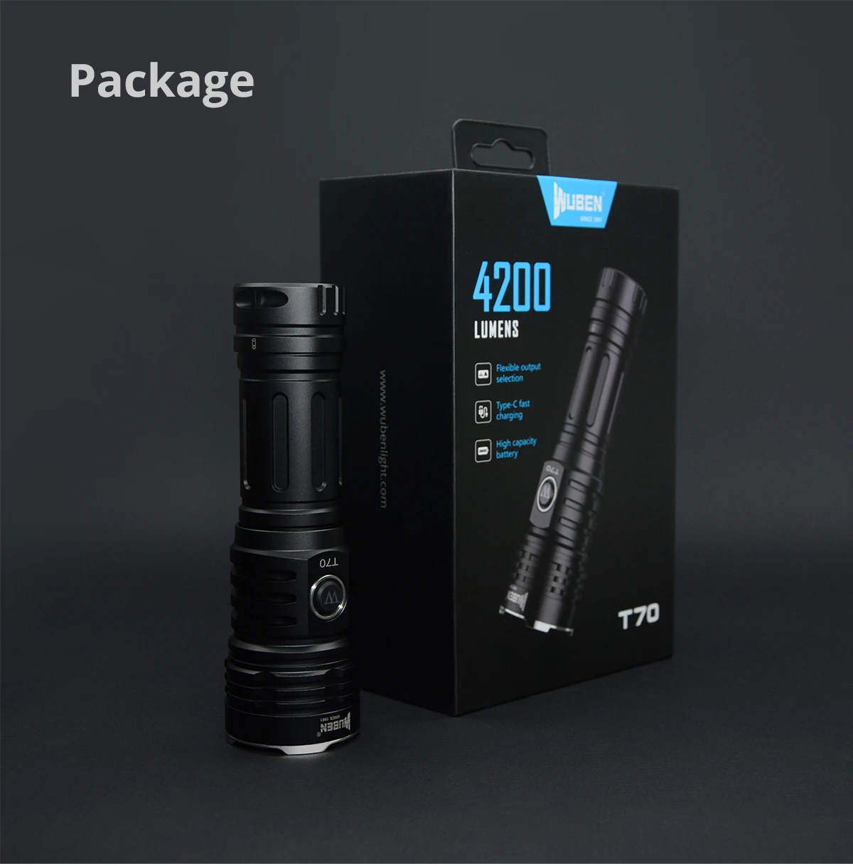 С жестким анодированием авиационного сплава алюминиевого сплава, WUBEN T70 фонарик использует 1 * CREE XHP70.2 светодиодный, Макс выход 4200 люменов, Макс расстояние луча 250 метров.