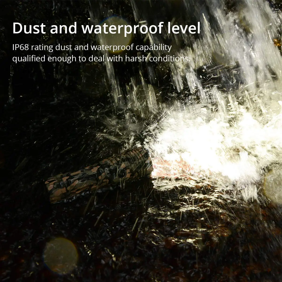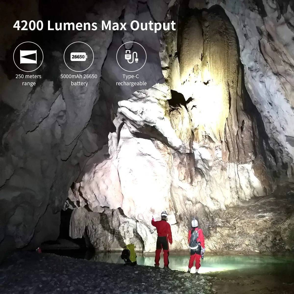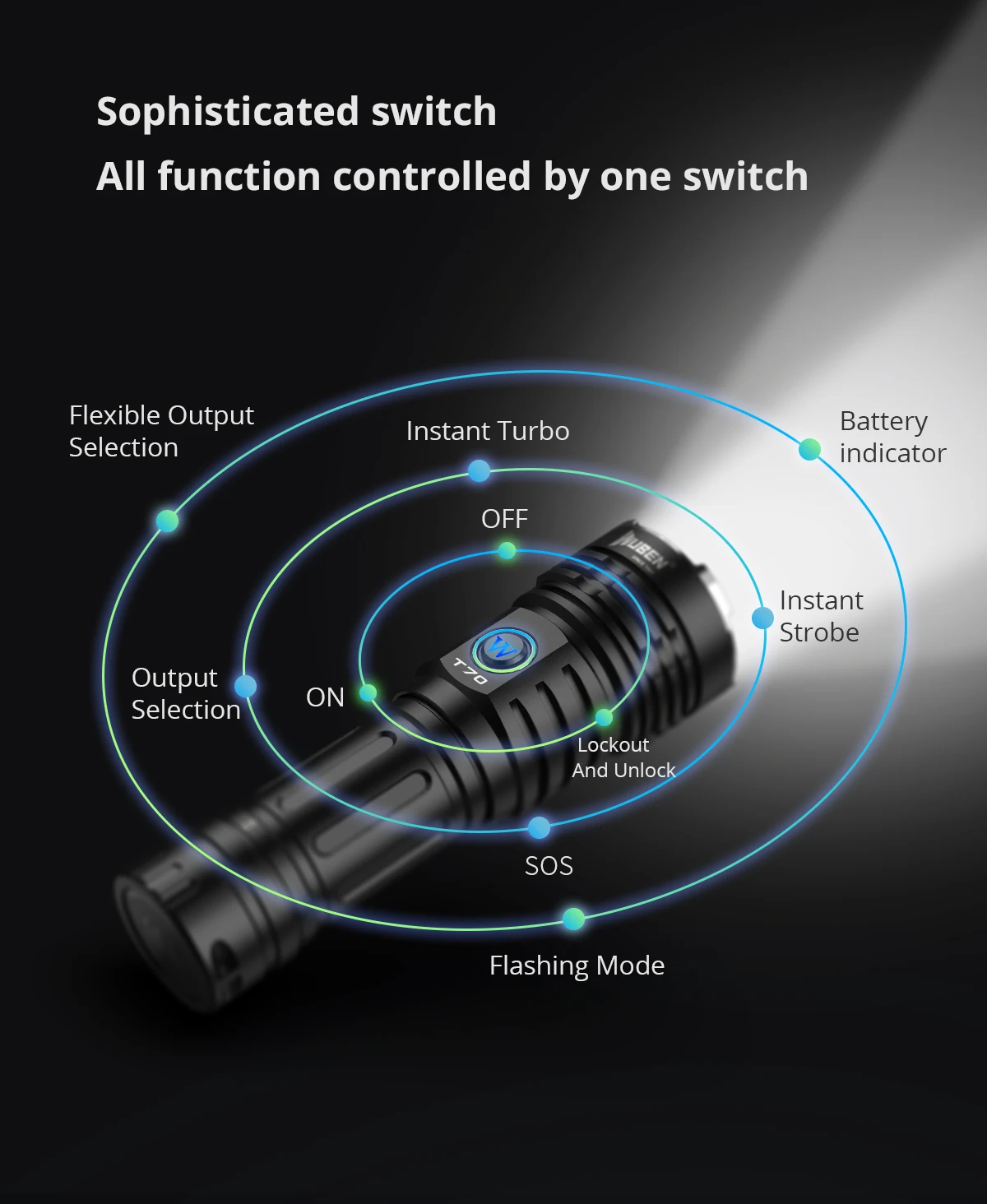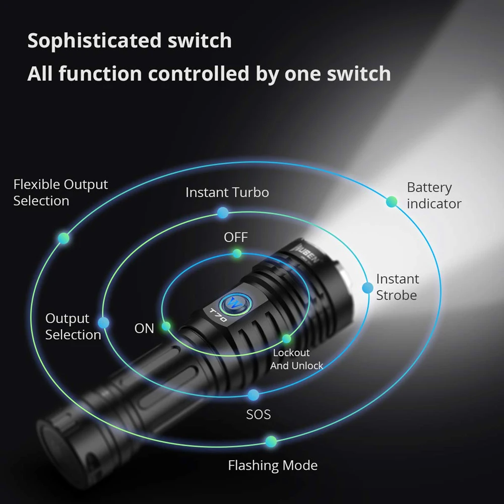 С жестким анодированием авиационного сплава алюминиевого сплава, WUBEN T70 фонарик использует 1 * CREE XHP70.2 светодиодный, Макс выход 4200 люменов, Макс расстояние луча 250 метров.