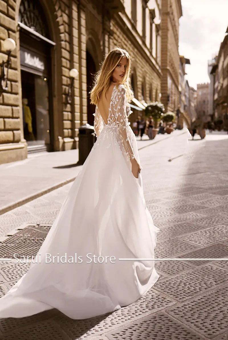 Сексуальное ТРАПЕЦИЕВИДНОЕ свадебное платье, 2021, модное кружевное платье с длинным рукавом, со шлейфом, пуговицами, иллюзия, Vestido De Noiva
