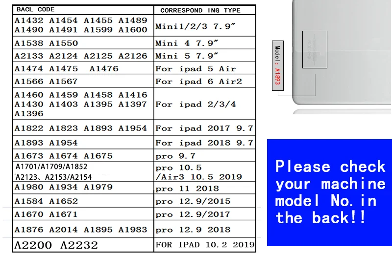 3. Для iPad Air1 / Air2:A1473 A1474 A1475 A1476