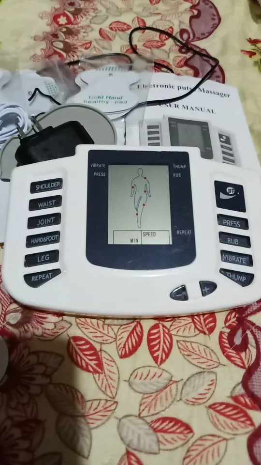 товар пришел быстро. комплектация видна на фото. работает отлично. Липучки-электроды многоразовые, использовал 5 раз, между первым и пятым прилипание разницы нет. Прибор работает на трёх батарейках типо АА. Есть несколько программ (в них чередуются импульсы то быстрое покалывание, то "удары“…). Сила удара регулируется плавно крутилкой, аппарат мощный (если резко крутануть на максимум, то мощность подынимится плавно). ранее использовал маленький (есть на фото), так вот этот круче. Однозначно хороший прибор.