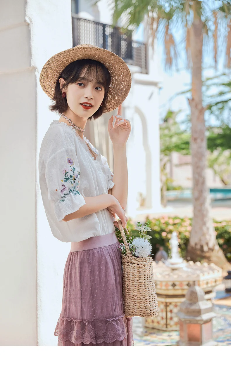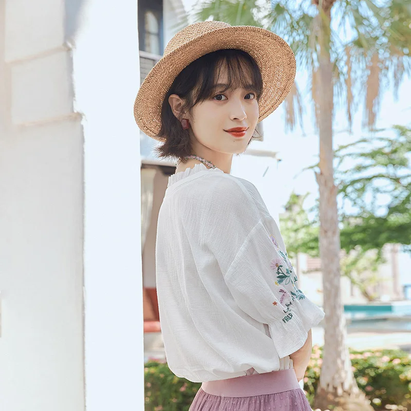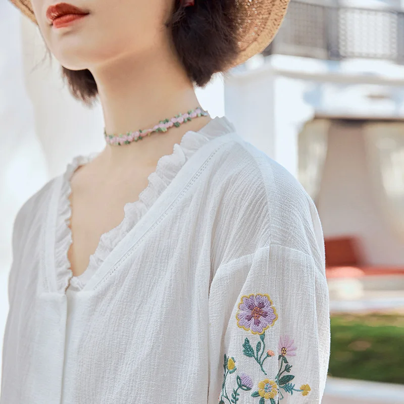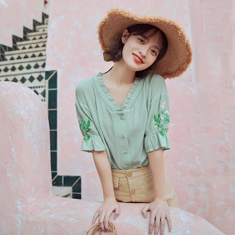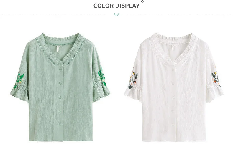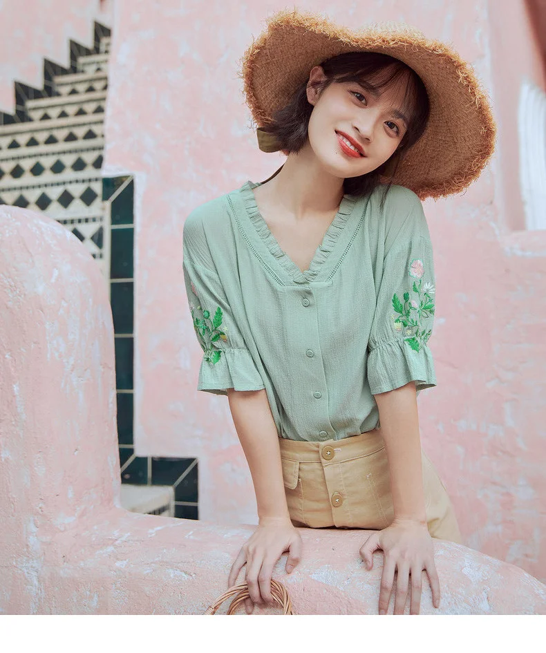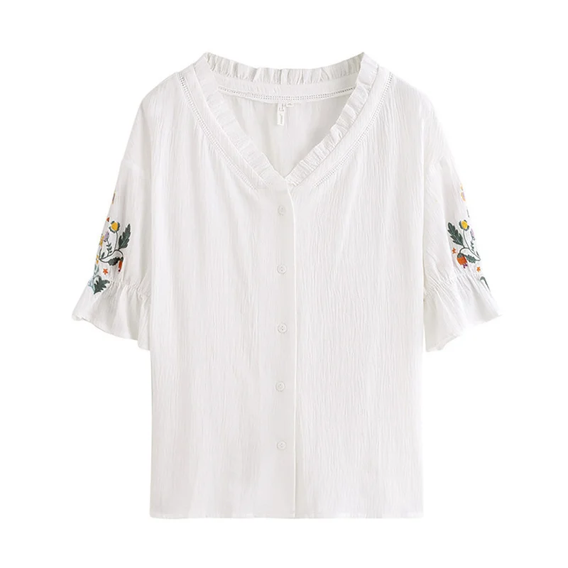 Женская кружевная блузка в стиле ретро, с коротким рукавом и v-образным вырезом, из чистого хлопка, с вышивкой, лето 2020