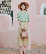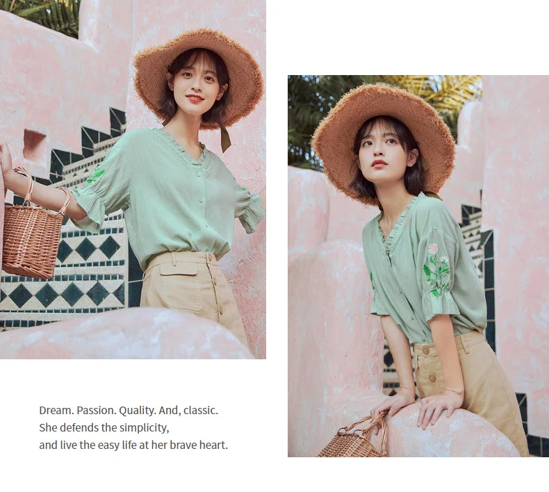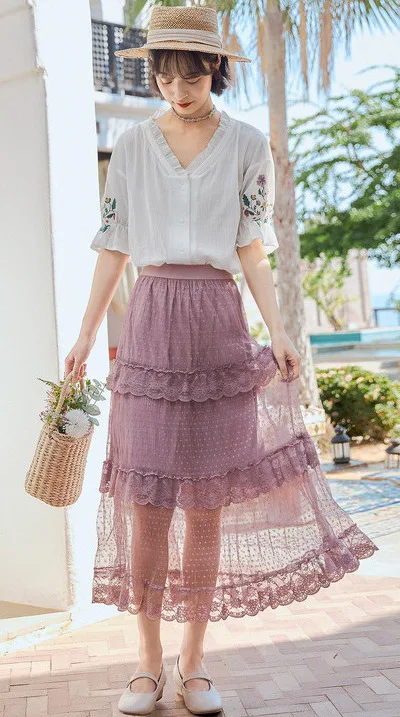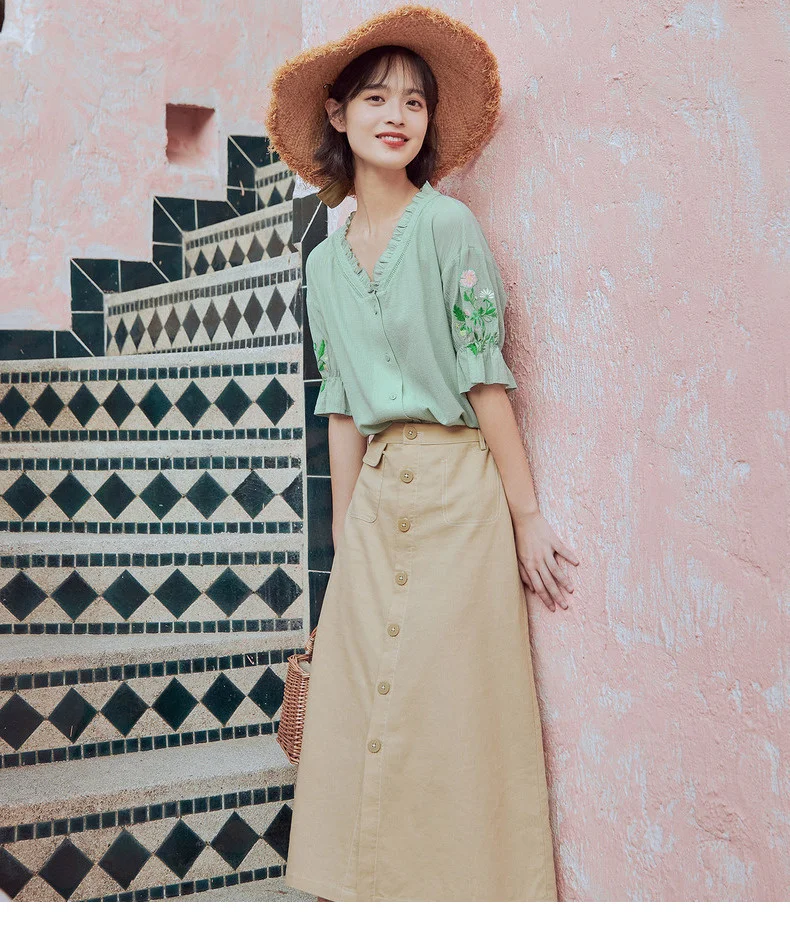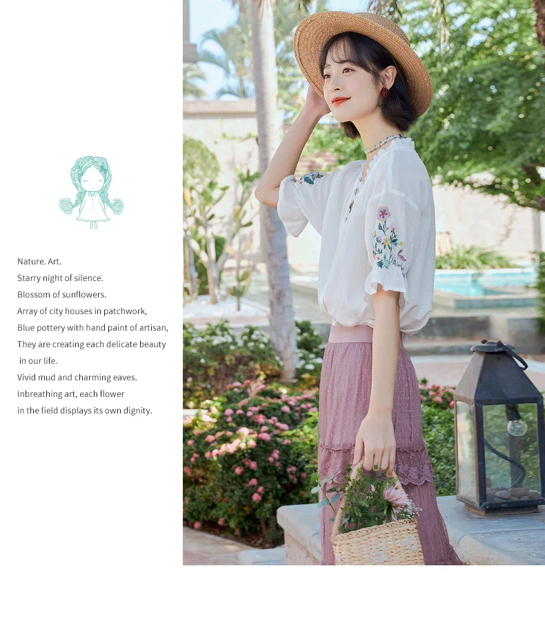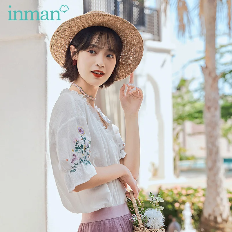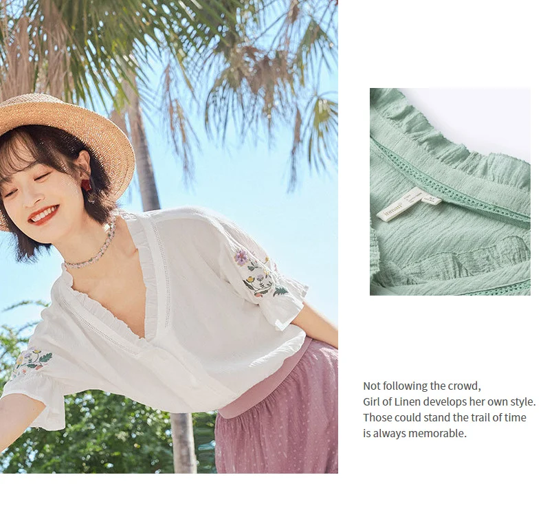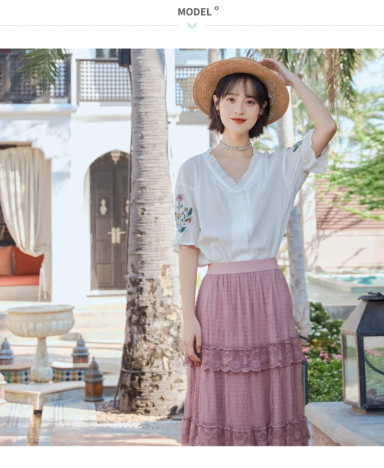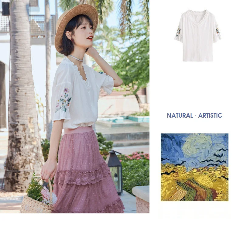 Женская кружевная блузка в стиле ретро, с коротким рукавом и v-образным вырезом, из чистого хлопка, с вышивкой, лето 2020