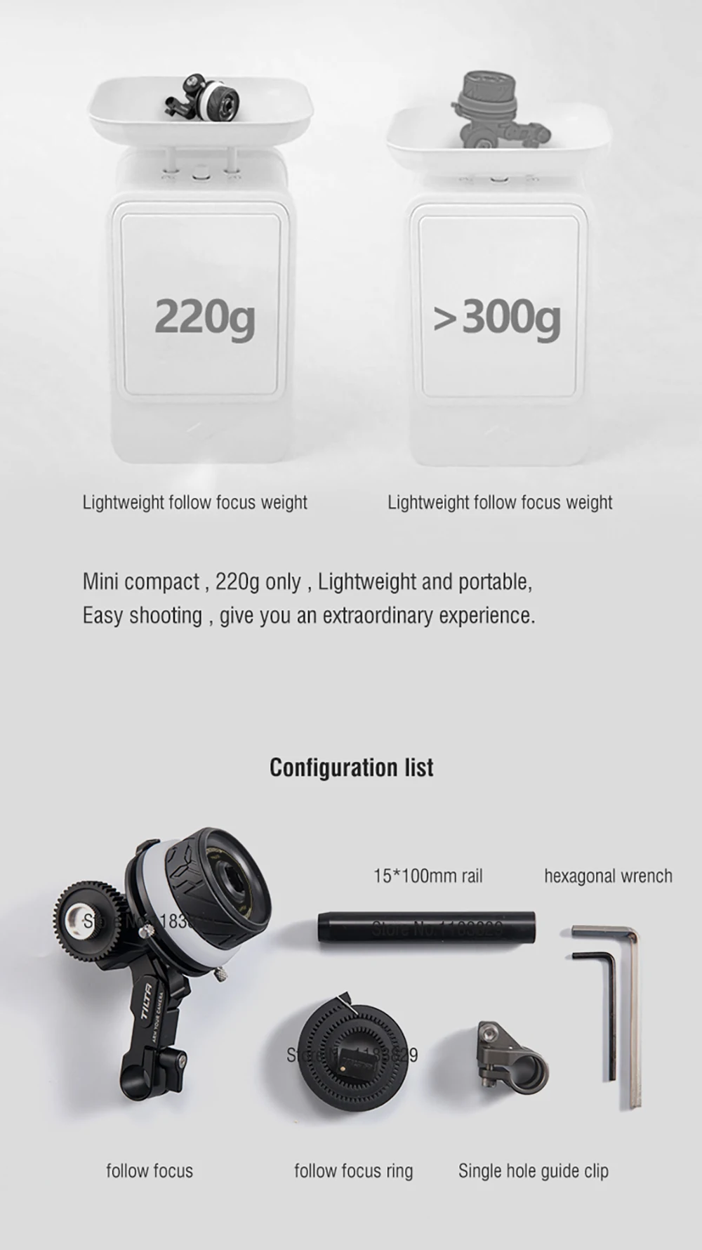 В комплект входят мини фоллоу-фокус, кольцо для фоллоу-фокусировки Zip Tie Follow, насадка на один стержень 15 мм, два шестигранных ключа, насадка на один стержень 15 мм и портативный чехол.