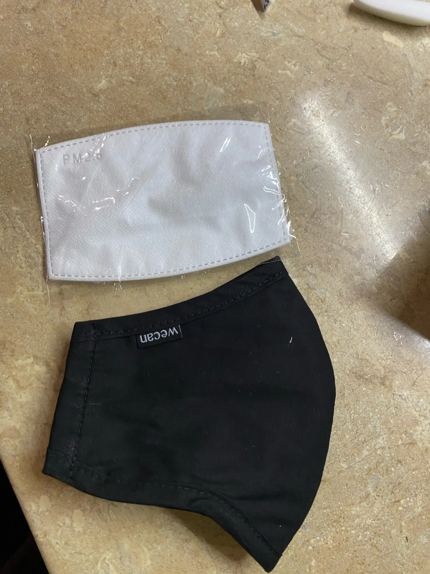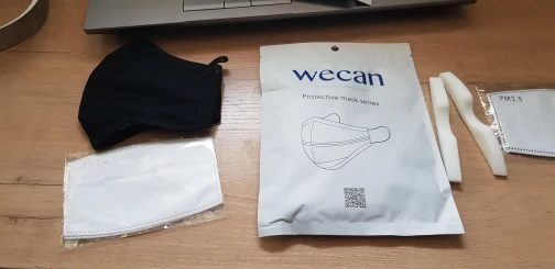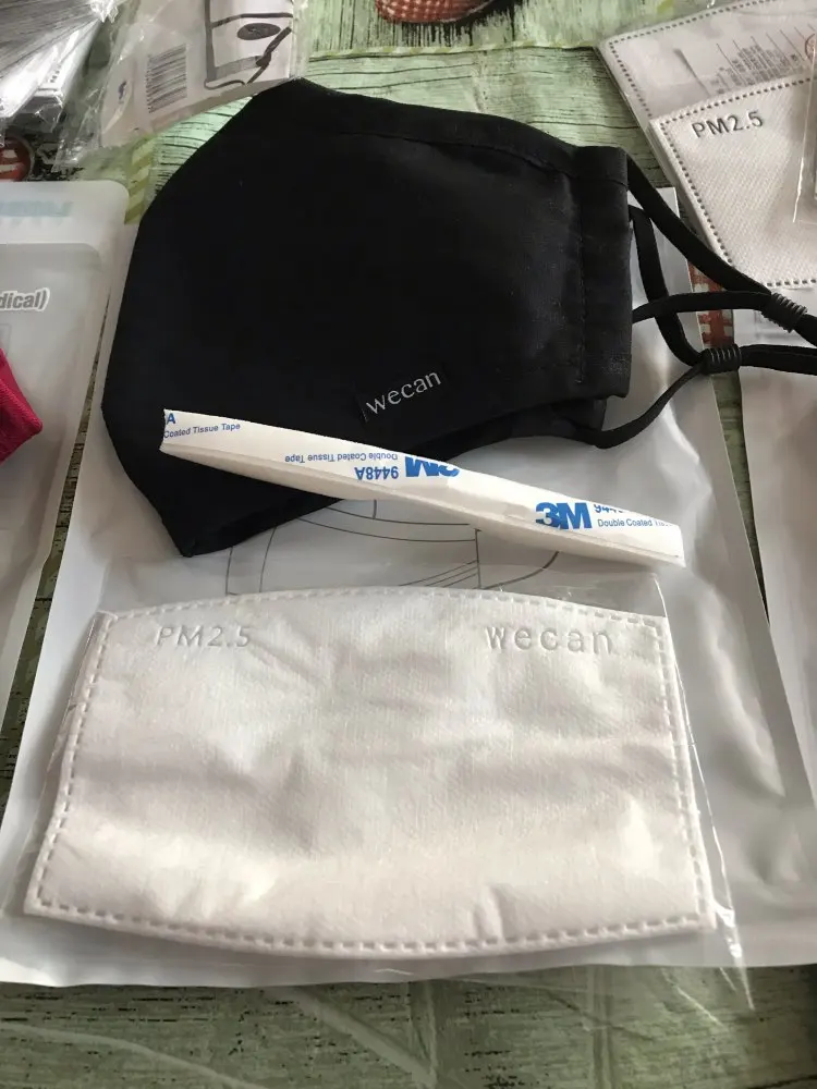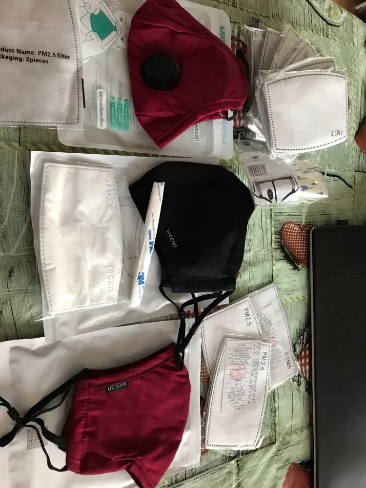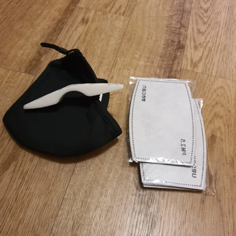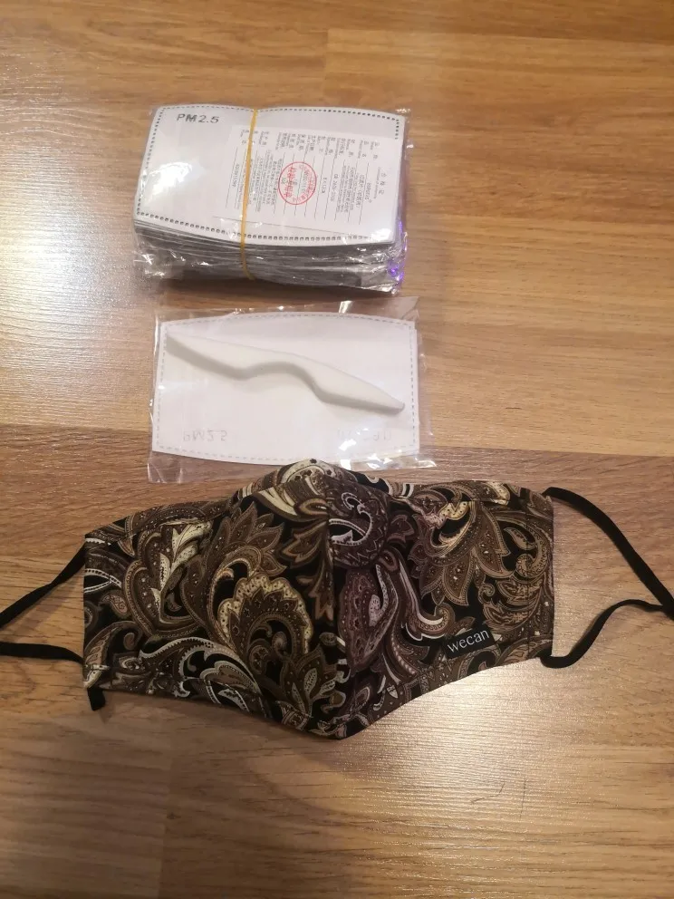 Маски пришли в отдельных упаковках, с запасными частями и фильтрами. Ткань плотный хлопок, внутри кармашки для фильтров, ушные петли регулируемые. Продавец также положил в посылку запасные поролоновые накладки для носа (крепятся на клейкую основу), чтобы маска не натирала.