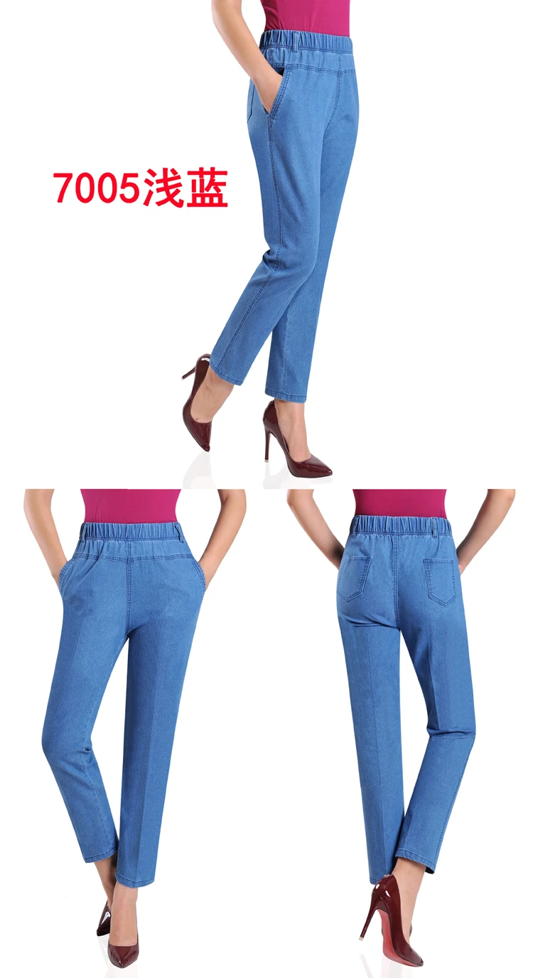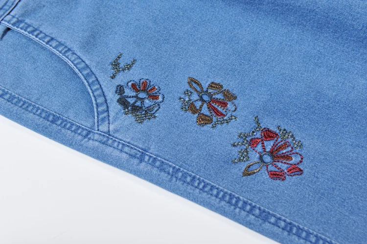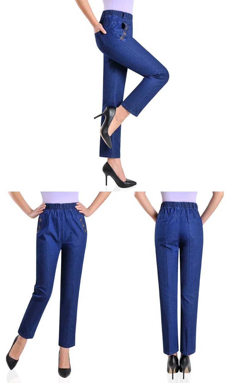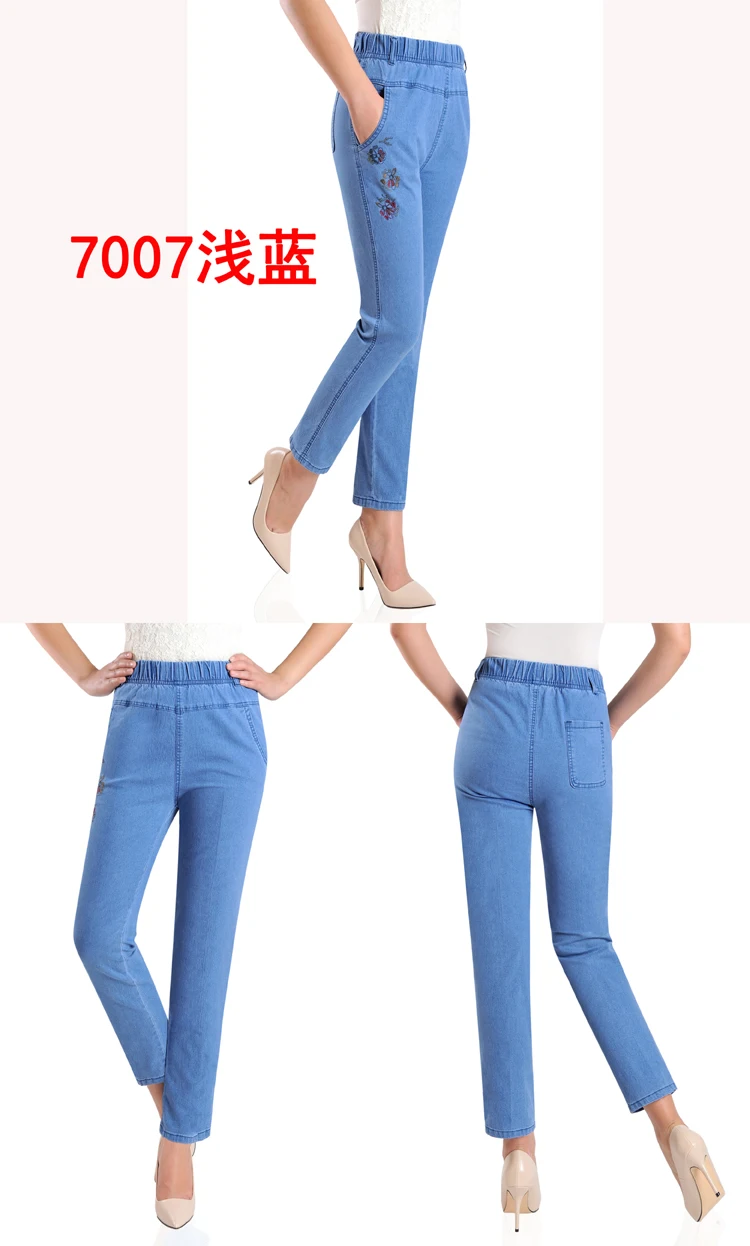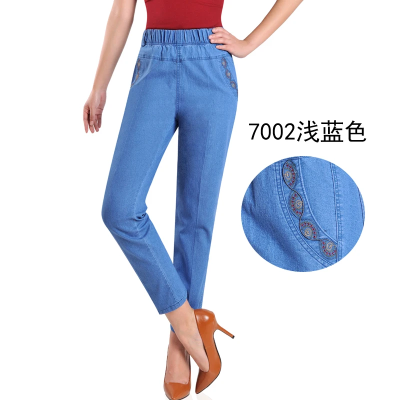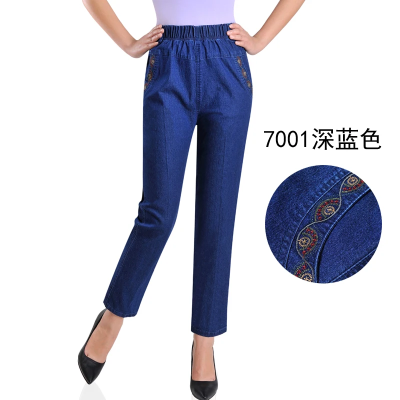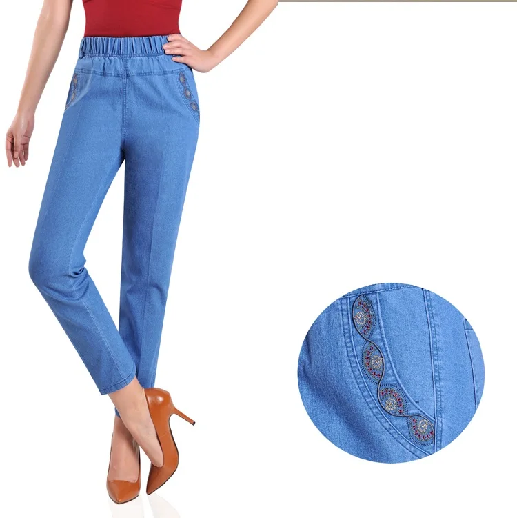 Джинсы женские с вышивкой, тонкие свободные повседневные штаны из денима для мам среднего возраста, с эластичным поясом, большие размеры, на лето