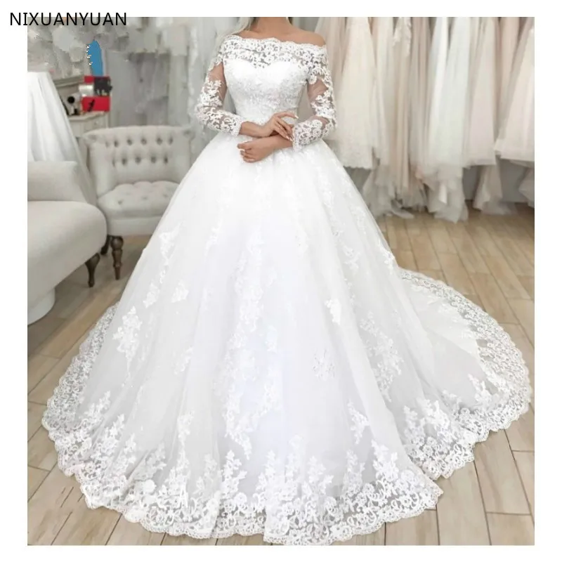 Винтажное свадебное платье с длинным рукавом, бальное платье, кружевное свадебное платье с открытыми плечами и аппликацией, свадебные наряды, свадебное платье