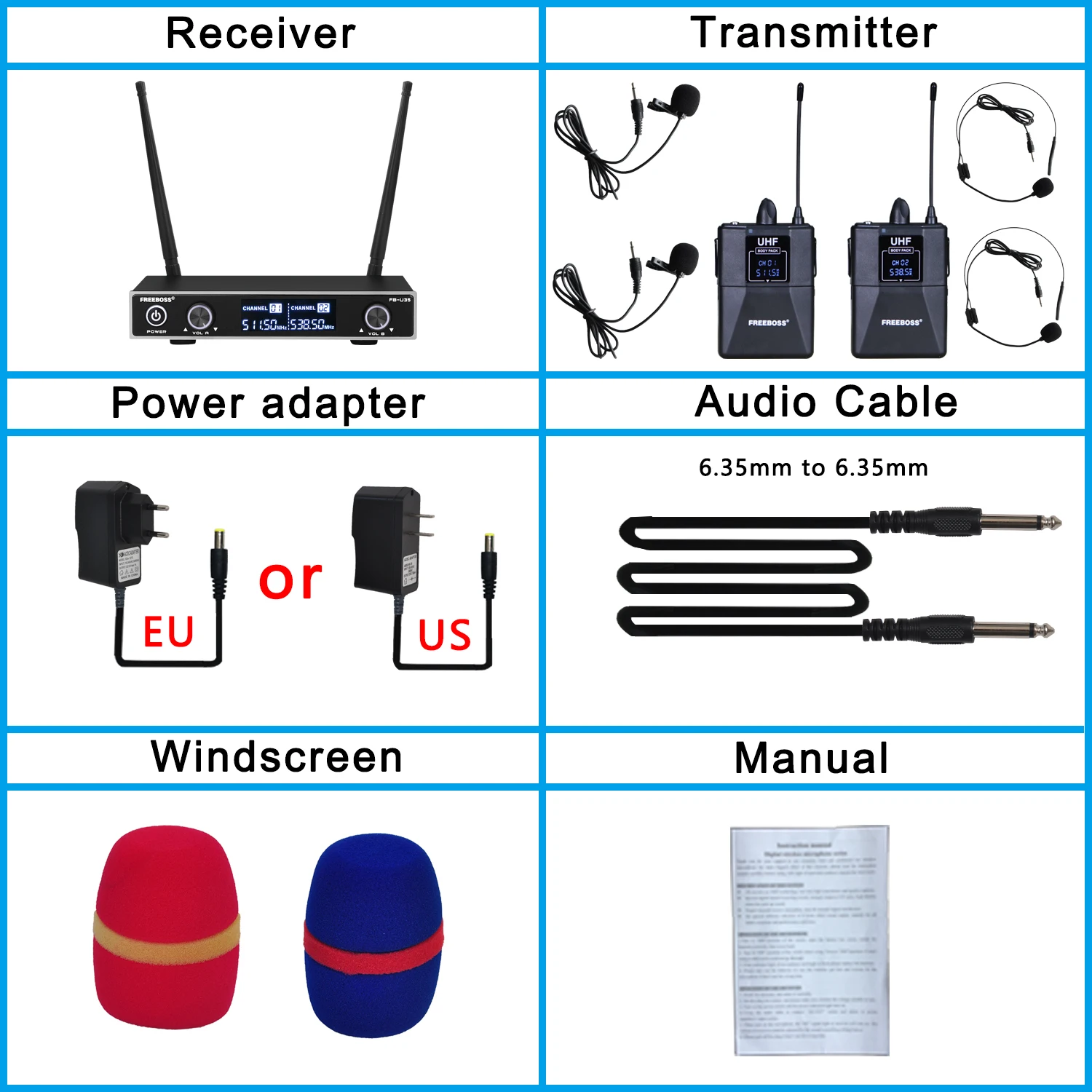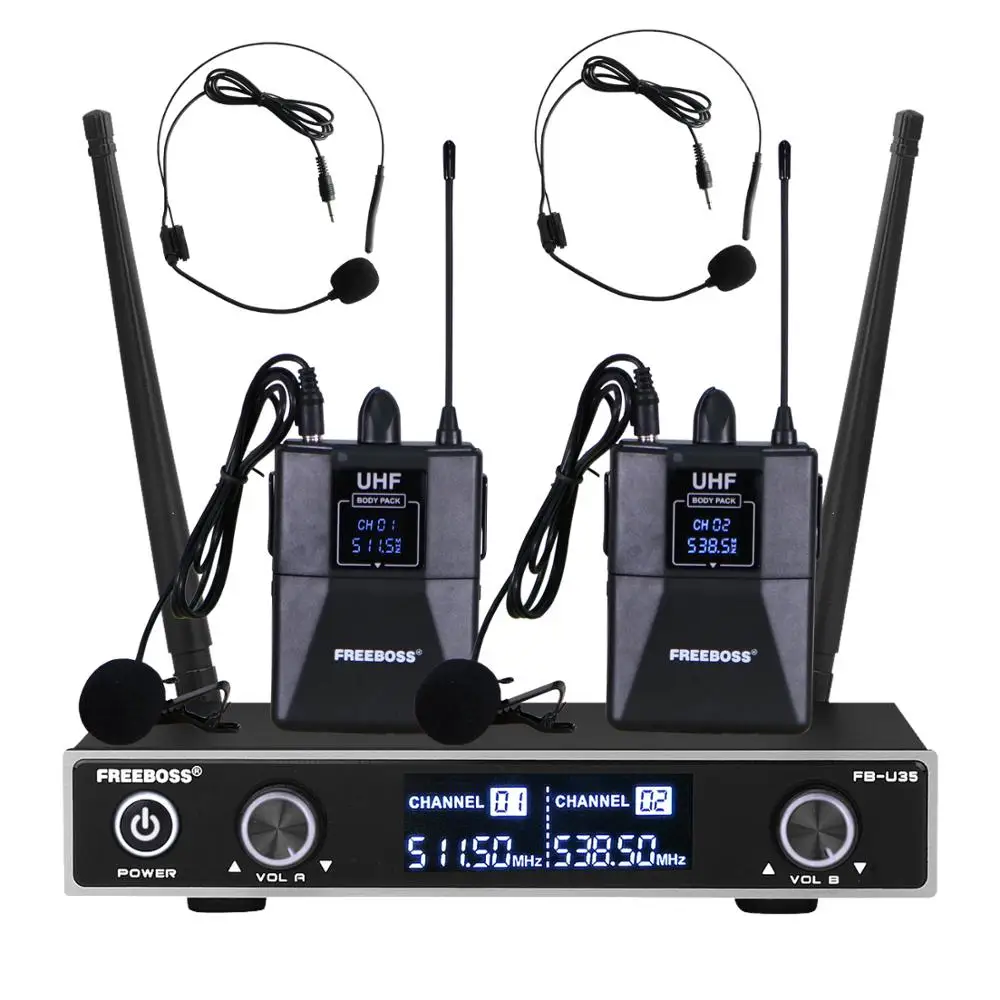FB-U35H2 двухполосная UHF Беспроводная микрофонная система с фиксированной частотой с 2 шт. боди + 2 шт. лавальер и гарнитура речевой микрофон