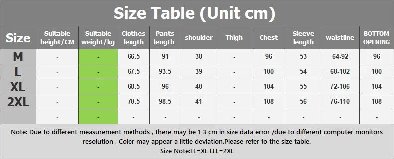 Таблица размеров (единица см)РазмерыПодходящая высота/смПодходящий вес/кгДлина одеждыДлина брюкПлечоБедраГрудьДлина рукаваЛиния талииНижнее отверстиеМ--66,59138-965364-9296L--67,593,539-1005468-102100XL--68,59640-1045572-1061042XL--70,598,541-1085676-110108----------Примечание: Из-за различных методов измерения возможна погрешность в размере 1-3 см/из-за различий в разрешении компьютерных мониторов цвет может немного отличаться. Пожалуйста, обратитесь к таблице размеров.Примечание по размеру: LL = XL LLL = 2XL