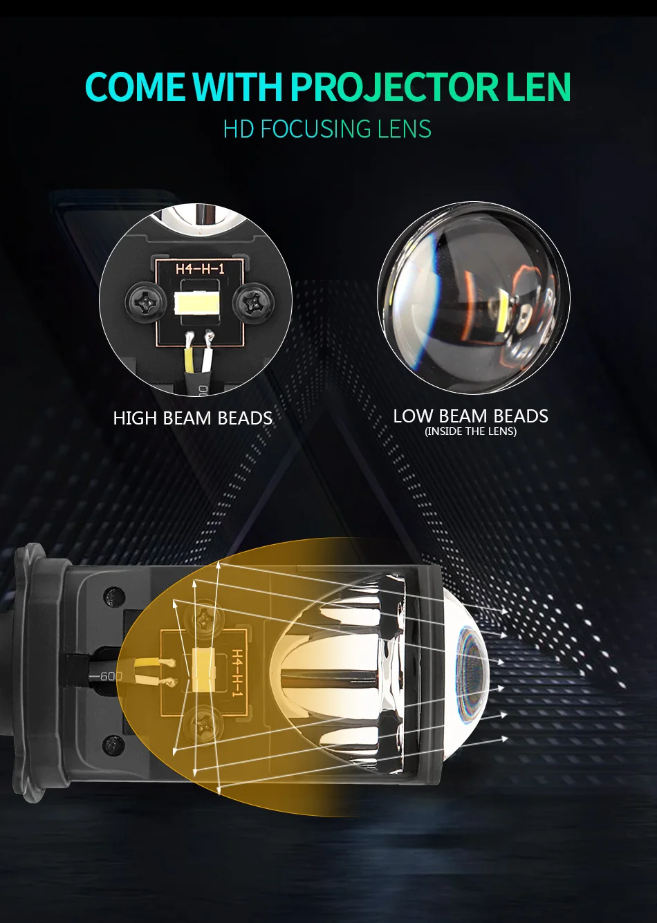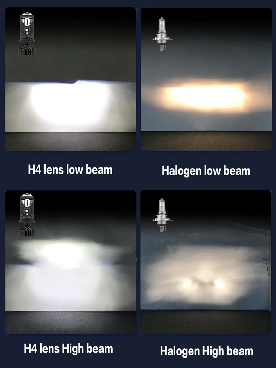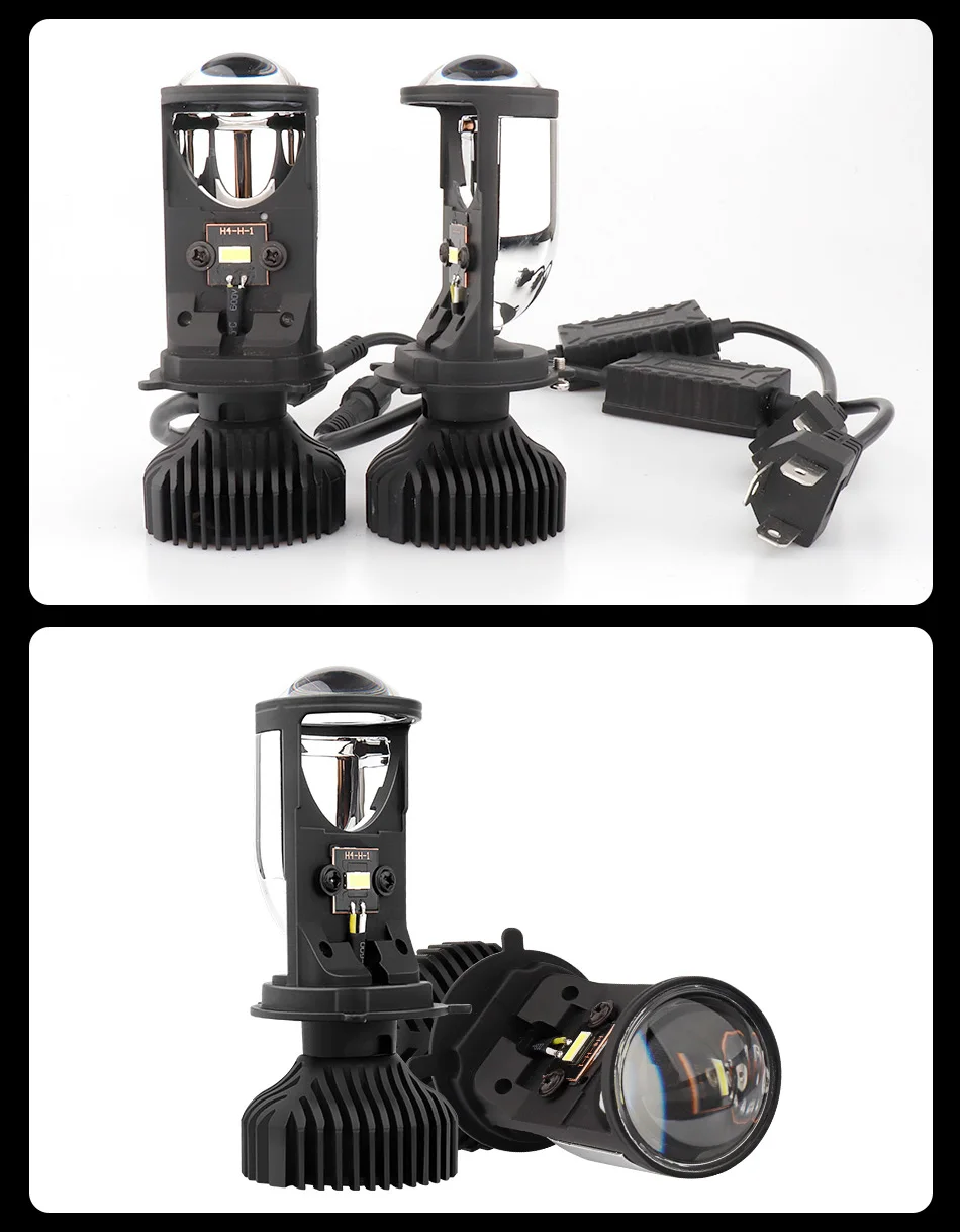 Преимущества продуктаНовое поступление! Инновационный дизайн, супер яркий, идеальный эффект конденсации, креативное решение проблемы астигматизма.Высокие Люмены:Используется высококачественная светодиодная микросхема, высокая светоотдача.Четкий и красивый рисунок луча, мгновенный старт ..В 5 раз ярче галогенных лампМатериал:Металлический материал, более роскошный и длительный срок службыПростая установка:Все-в-одном Алюминиевый материал и дизайн позволяют легко установить.Plug-and-Play Прямая замена через 20 минут. Нет необходимости в дополнительной операции и нет необходимости разблокировать кнопку.Особенности:Мощность: H4, дальний свет (35 Вт/лампа 70 Вт/пара)H4, ближний свет (25 Вт/лампа 50 Вт/пара)Гарантия: гарантия 1 годСветовой поток: черный 10 лм/лампа. 20000/параМодель: H4 светодиодный мини-объектив проектораРабочее напряжение: 12 В постоянного токаЦветовая температура: 6000K белыйIP65 Номинальное уплотнение воды и пылиМатериал: авиационный 6063 алюминиевый профильРабочая температура: -40-80 градусов ЦельсияСрок службы более 300 часовИспользование: фара① Может быть установлен непосредственно② Необходимо снять лампочный светильник** Пожалуйста, подтвердите пригодность. Спасибо **