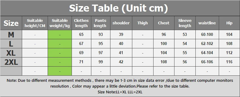 Таблица размеров (единица см)РазмерыПодходящая высота/смПодходящий вес/кгДлина одеждыДлина брюкПлечоБедраГрудьДлина рукаваЛиния талииБедраМ--659339-965360-100104L--679540-1005462-102108XL--699741-1045564-1041122XL--719942-1085666-106116----------Примечание: Из-за различных методов измерения возможна погрешность в размере 1-3 см/из-за различий в разрешении компьютерных мониторов цвет может немного отличаться. Пожалуйста, обратитесь к таблице размеров.Примечание по размеру: LL = XL LLL = 2XL