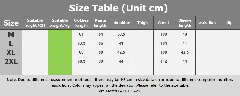 Таблица размеров (единица см)РазмерыПодходящая высота/смПодходящий вес/кгДлина одеждыДлина брюкПлечоБедраГрудьДлина рукаваЛиния талииБедраМ--618439,5-10040--L--63,58641-10441--XL--668842,5-10842,5--2XL--68,59044-11244------------Примечание: Из-за различных методов измерения возможна погрешность в размере 1-3 см/из-за различий в разрешении компьютерных мониторов цвет может немного отличаться. Пожалуйста, обратитесь к таблице размеров.Примечание по размеру: LL = XL LLL = 2XL
