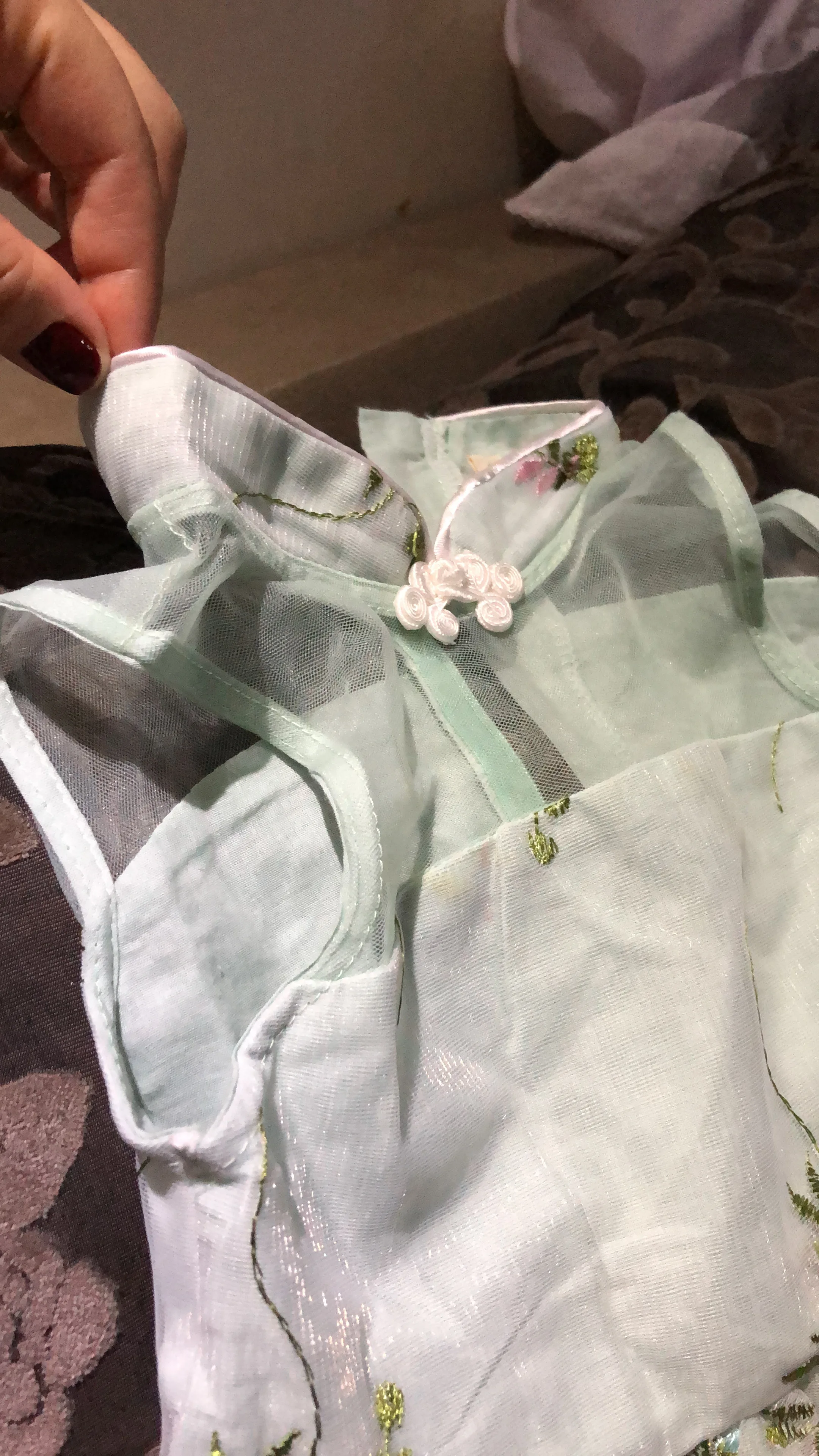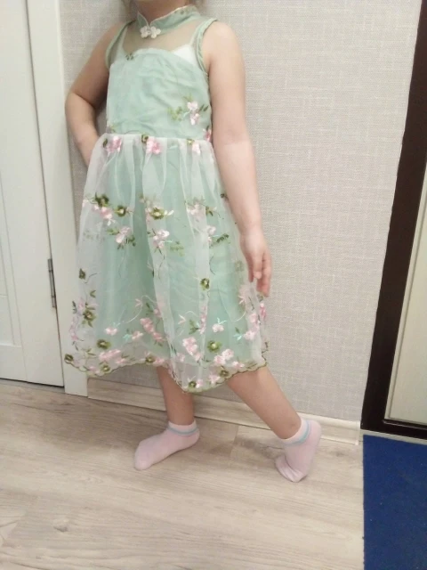 Платье пришло за 3 недели. на рост 116 см заказала 6 размер. Норм. в областе рук правда намного топырщится..волной слегка♀️ ткань по качеству на 4-. сумочка так себе..нам особо цветов не досталось на ней. Нитки местами торчат между тканью ( под тюлью белые см последнее фото у молнии на спинке)...но можно обрезать, то есть убрать. Запах слегка имеется. С боку если смотреть..если ребёнок не худенький..упитанный, то перед приподнимается. Особенность фигуры