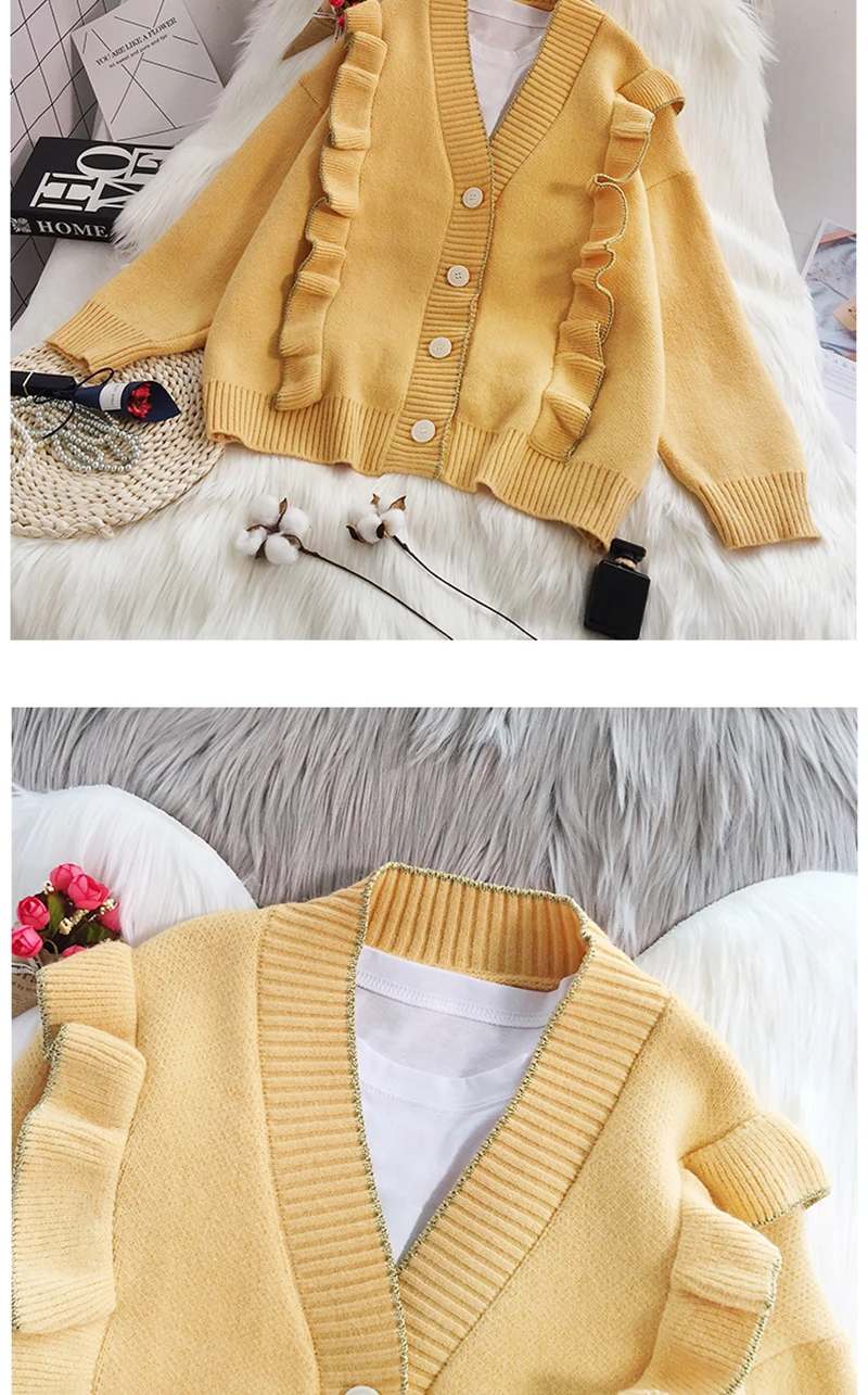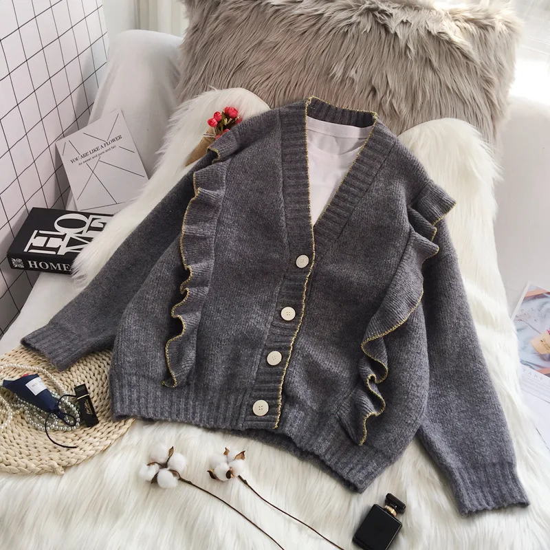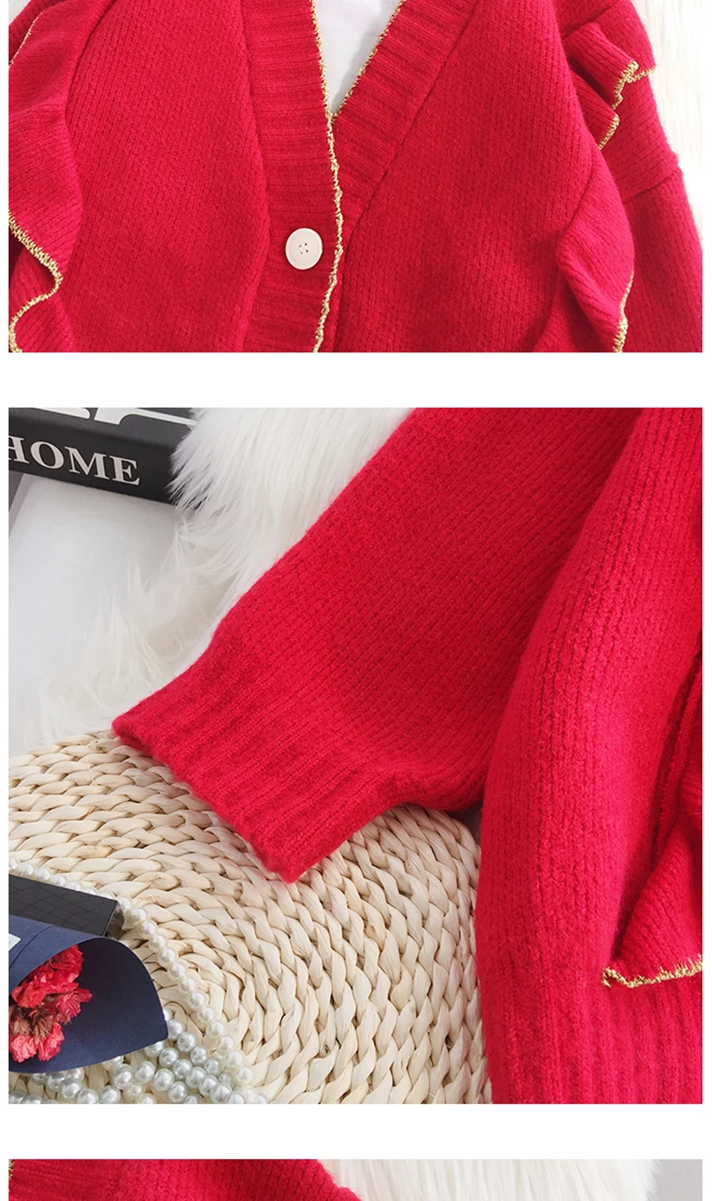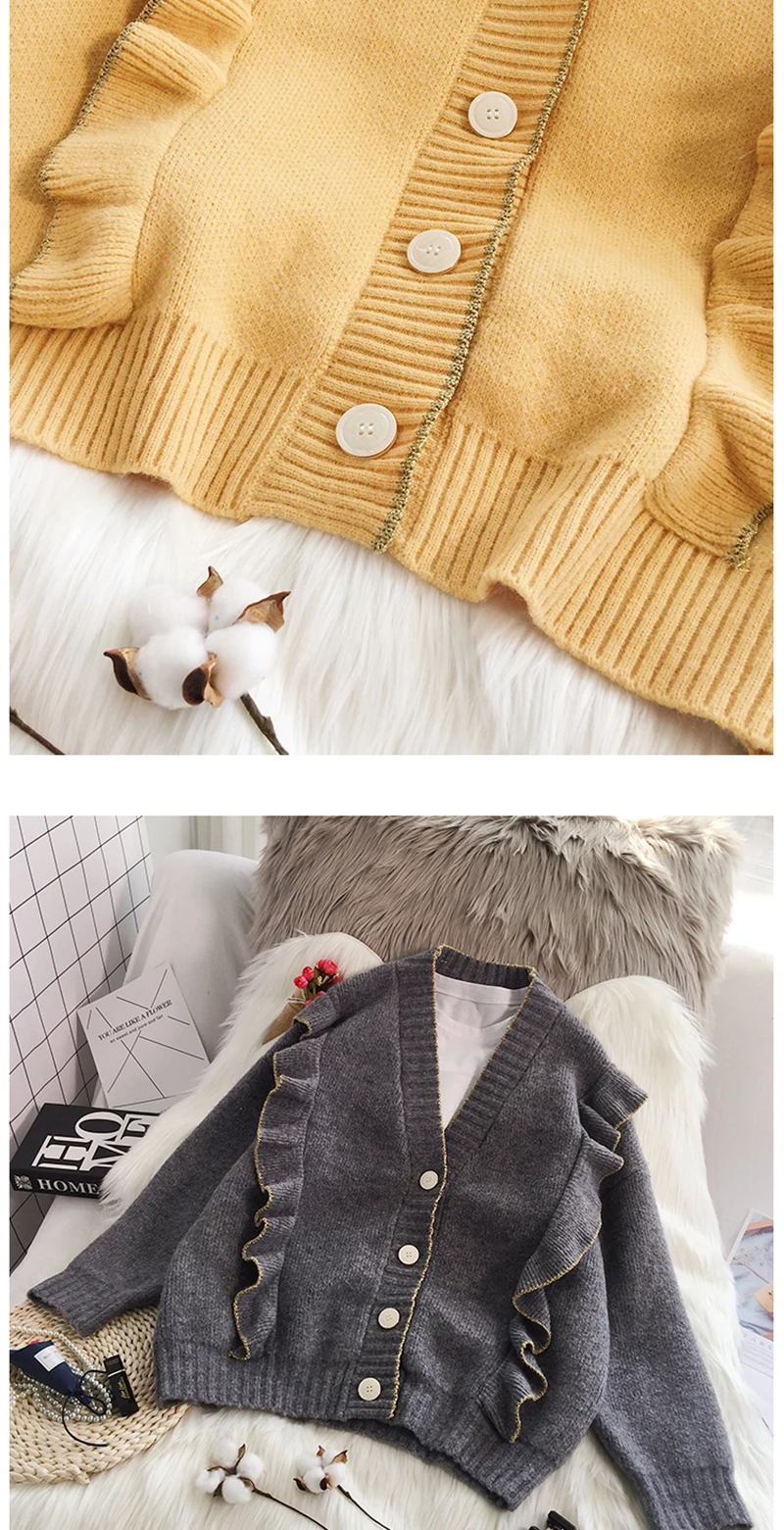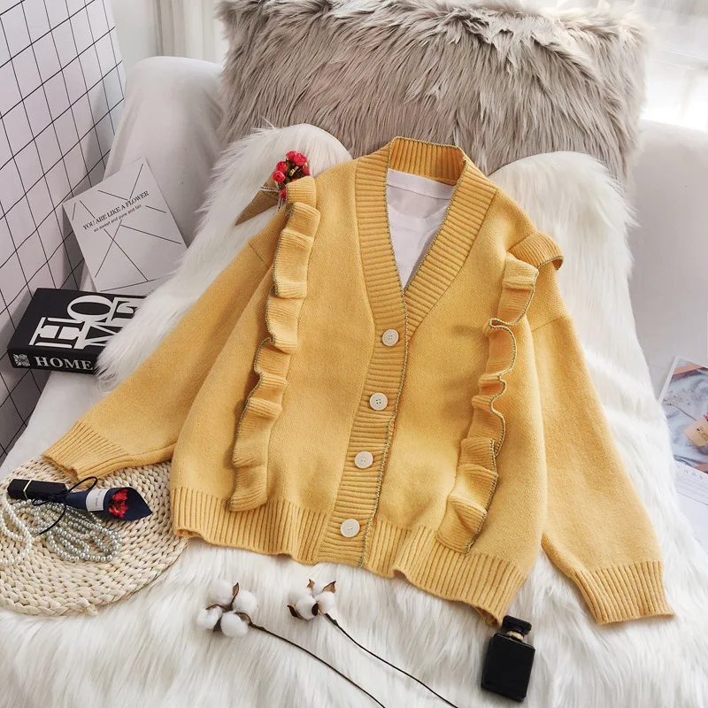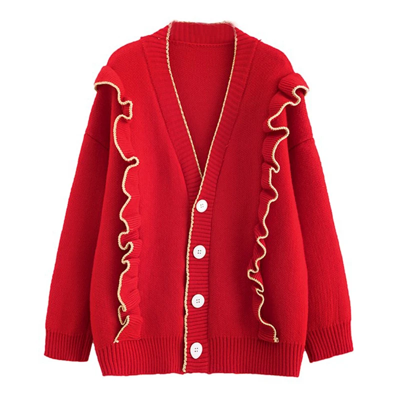 Весенний вязаный кардиган, свитер, пальто оверсайз с длинным рукавом и оборками, женские корейские свитера красного, бежевого, серого, желтого цветов, верхняя одежда для женщин