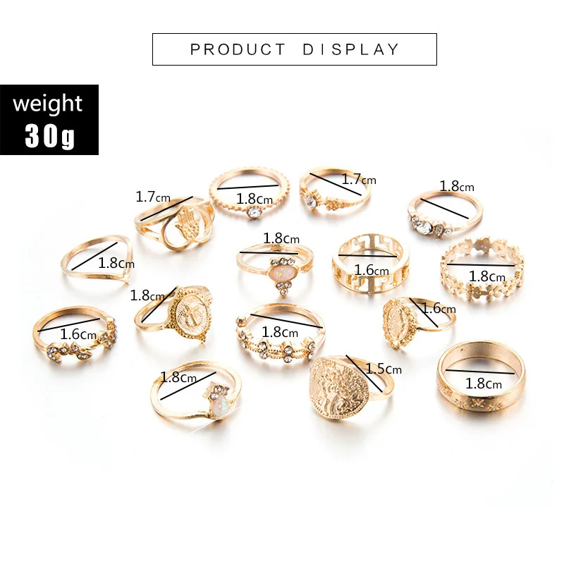 Золотые кольца в стиле бохо с изображением девы Марии, 15 шт.компл., для женщин, сердце, Фатима, руки, кольца, крест, лист, геометрические украшения Kольцо