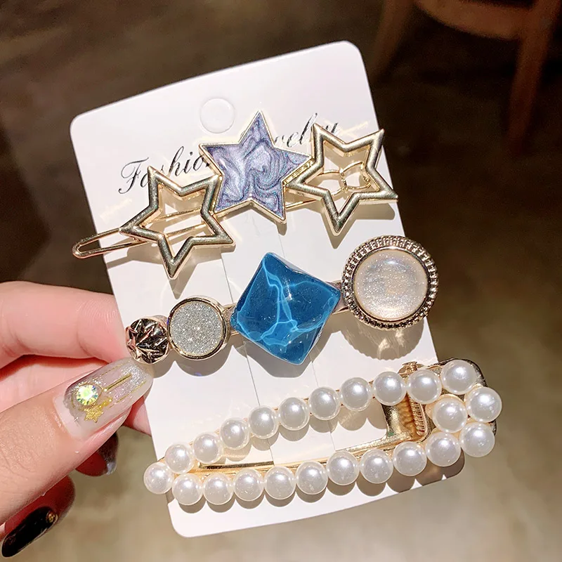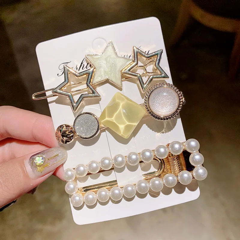 3 шт.компл., милые заколки для волос с жемчугом, модные заколки для волос со звездами, геометрические акриловые украшения, Женские винтажные аксессуары для волос