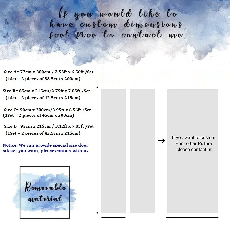Наши дверные фрески могут быть применены к любой чистой, гладкой и плоской поверхности, такой как двери, стены, окна, металла и стекла и могут быть удалены, не оставляя следов, но не могут быть повторно расположены или повторно использованы после нанесения на вашу дверь или поверхность.