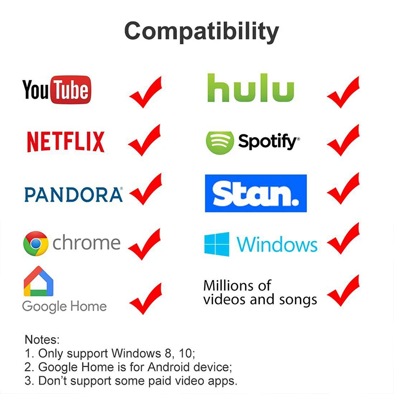 Быстрое свободное и идеальное изображение с разрешением HD 1080P, высоким разрешением, обмен изображением высокой четкости с друзьями и семьей. Высокопроизводительная функция зеркального отображения, Поддержка Airplay, Miracast, DLNA. Поддержка full HD беспроводной передачи аудио и видео, поддержка HDMI HD выхода, стабильная передача, сильная совместимость. Он может отбрасывать видео, музыку, картинку, приложения, презентации, веб-сайт, слайд-шоу на ваши устройства с большим экраном. Подходит для зеркального отображения небольших экранов (смартфонов, планшетов, ПК и т. Д.) на большой экран, такой как HDTV, проектор, монитор и т. Д. Просто подключи и играй, не нужно устанавливать драйверы, наслаждаясь удивительными изображениями с большого экрана. Совместим с: iOS 10,0, Android,MacBook,Windows 10 и так далее. Из-за защиты авторских прав на носители Некоторые носители будут заблокированы, например, NETFLIX и другие крупные компании потокового вещания.
